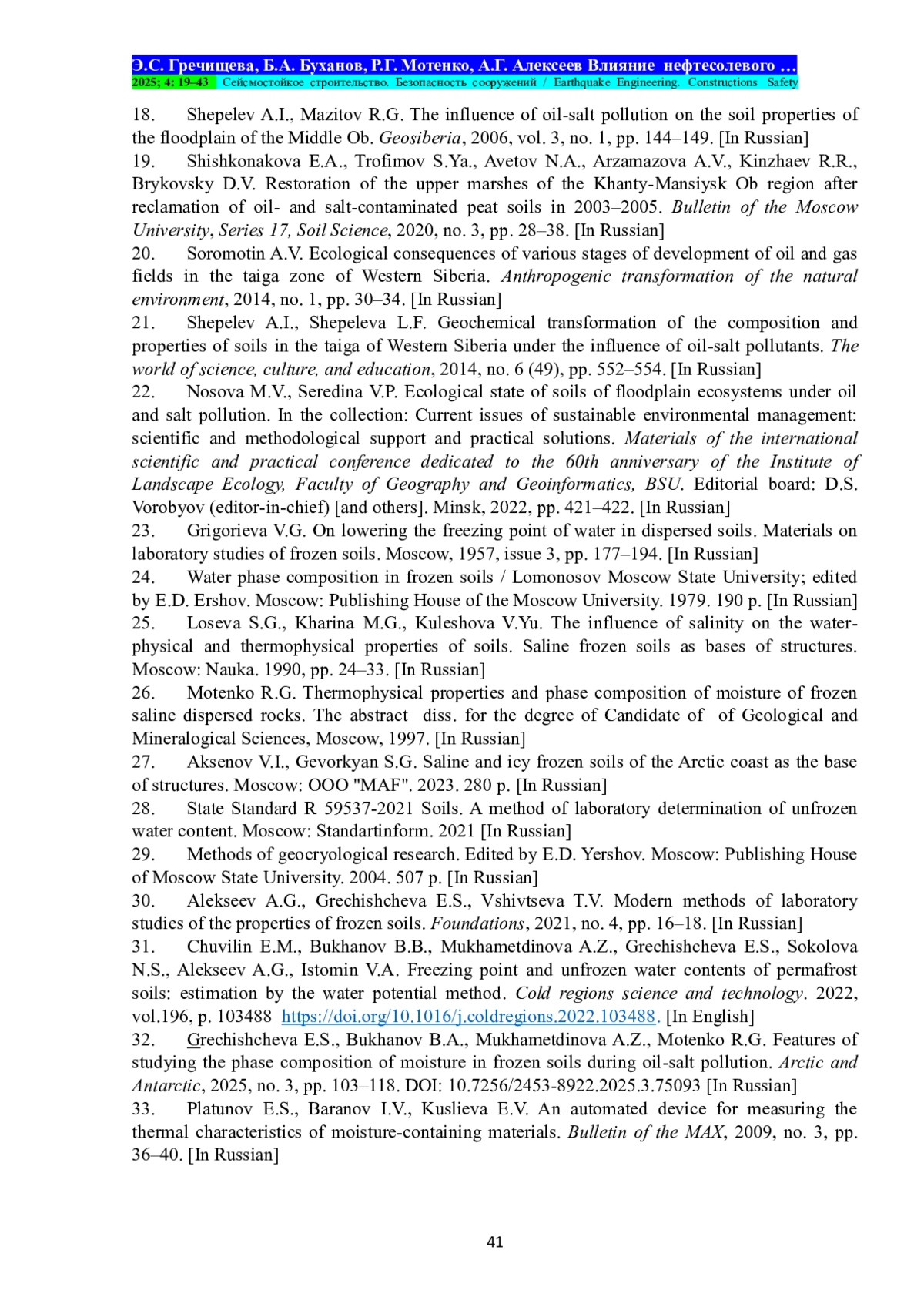 32. Гречищева Э.С., Буханов Б.А., Мухаметдинова А.З., Мотенко Р.Г. Особенности исследования фазового состава влаги мерзлых грунтов при нефтесолевом загрязнении // Арктика и Антарктика. 2025. № 3. С. 103-118. DOI: 10.7256/2453-8922.2025.3.75093