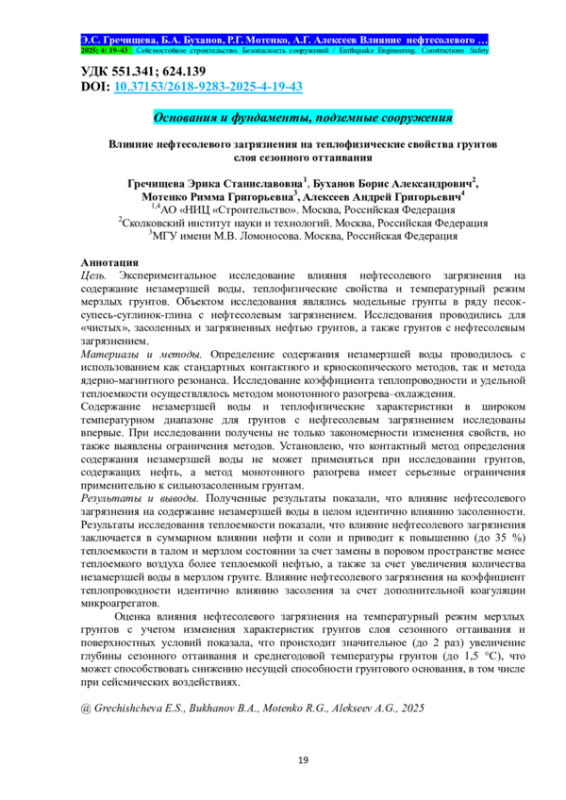 37. Журавлев И.И., Мотенко Р.Г., Ершов Э.Д. Формирование теплофизических свойств мерзлых дисперсных пород при их загрязнении нефтью и нефтепродуктами // Геоэкология. 2005. № 1. С. 50-61.