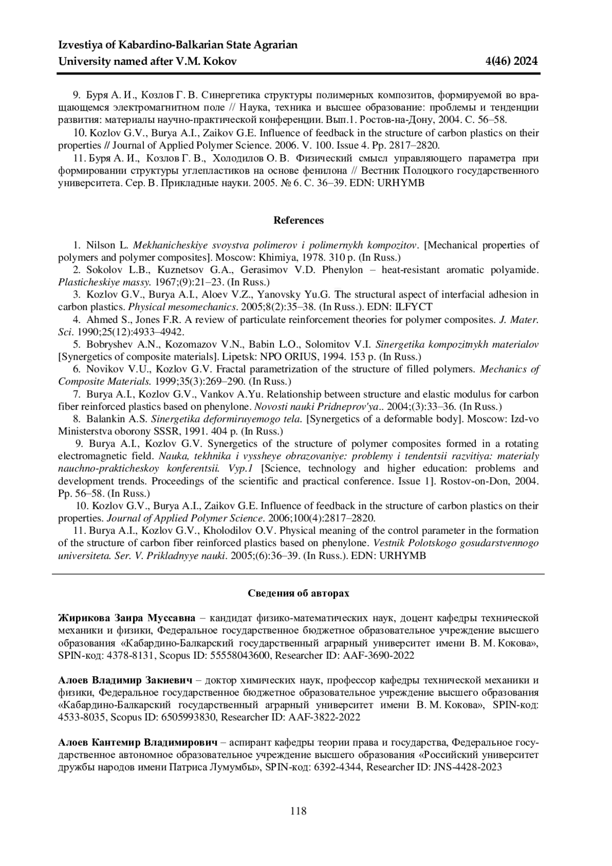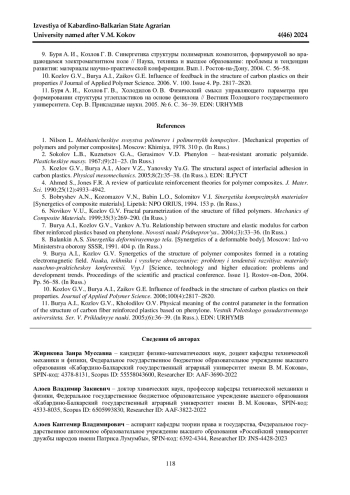 10. 	Kozlov G.V., Burya A.I., Zaikov G.E. Influence of feedback in the structure of carbon plastics on their properties // Journal of Applied Polymer Science. 2006. V. 100. Issue 4. Pp. 2817-2820. EDN: KGFMLQ