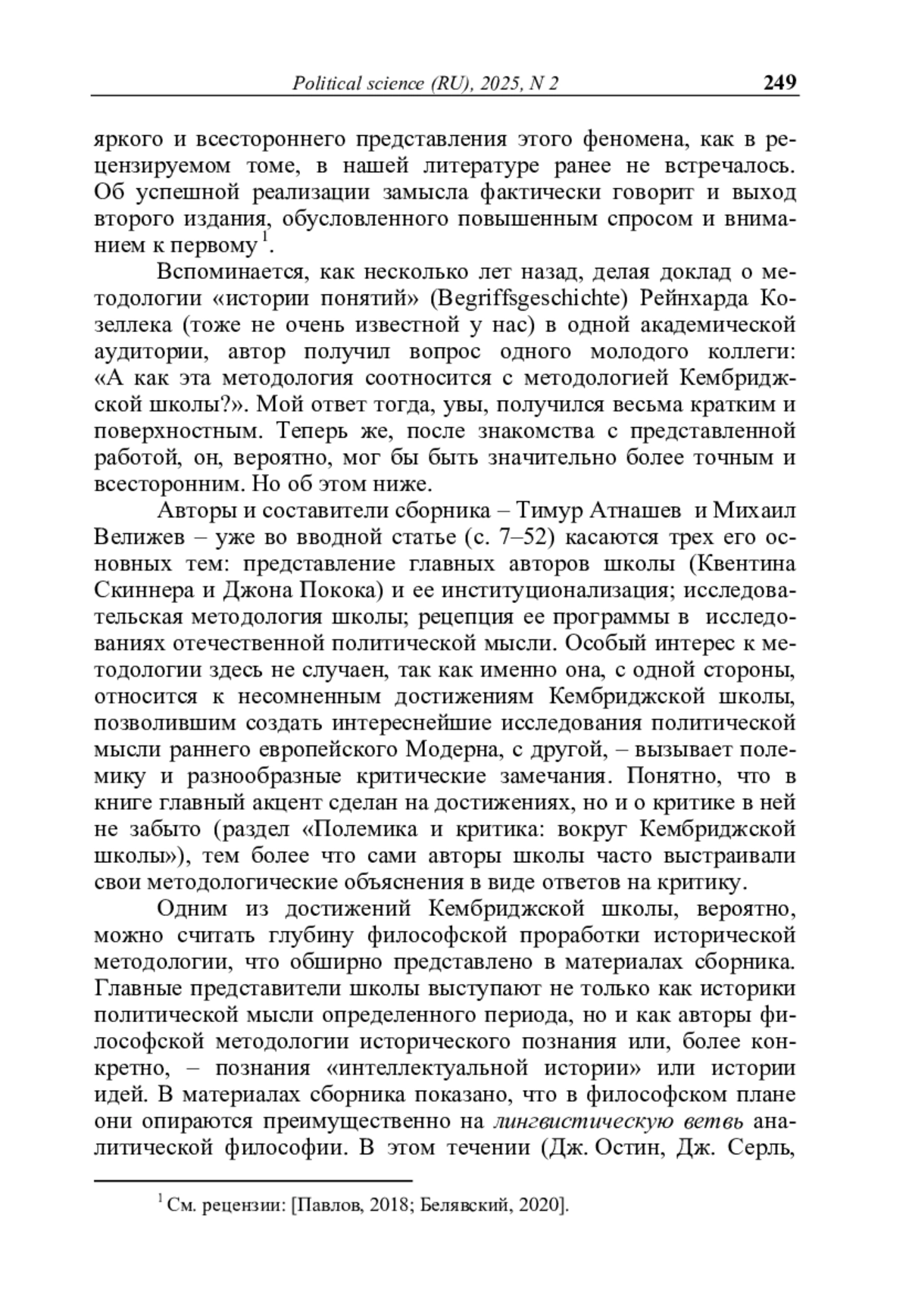 Рец. на кн.: Кембриджская школа. Теория и практика интеллектуальной истории / сост. Т. Атнашев, М. Велижев. – 2-е изд. – М.: Новое литературное обозрение, 2023. – 632 с. (Серия «Интеллектуальная история»)