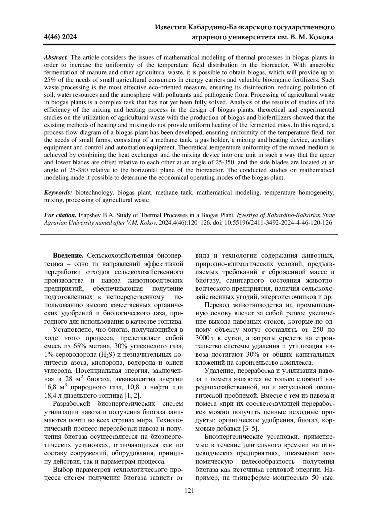 7. Оптимизация параметров и режимов работы биогазовой установки для достижения максимального выхода биометана / А. Г. Фиапшев, М. М. Хамоков, О. Х. Кильчукова, Б. Б. Темукуев, Б. А. Фиапшев // Энергобезопасность и энергосбережение. 2021. № 3. С. 41-45. DOI: 10.18635/2071-2219-2021-3-41-45 EDN: EZKGZU