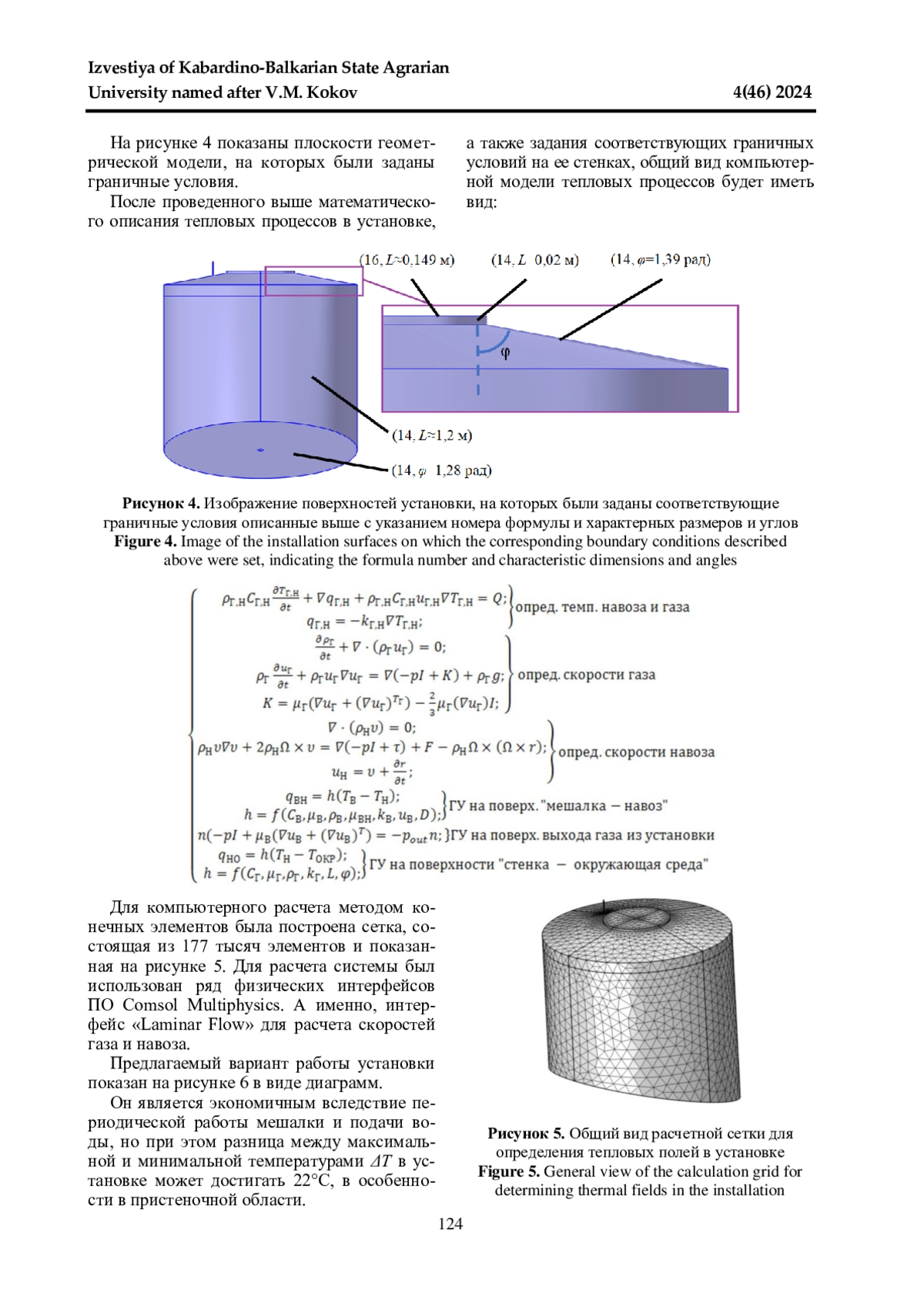 В статье рассматриваются вопросы математического моделирования тепловых процессов в биогазовых установках с целью повышения равномерности распределения температурного поля в биореакторе. При анаэробном сбраживании навоза и других сельскохозяйственных отходов можно получить биогаз, который позволит обеспечить до 25% потребности малых сельхозпотребителей в энергоносителях и ценные биоорганические удобрения. Такая переработка отходов является наиболее эффективным эколого-ориентированным мероприятием, обеспечивающим его обеззараживание, снижение загрязнения почвы, водных ресурсов и атмосферы загрязняющими веществами и патогенной флорой. Переработка сельскохозяйственных отходов в биогазовых установках - сложная задача, которая в настоящее время еще не решена в полной мере. Анализ результатов исследований эффективности процесса перемешивания и нагрева в конструкции биогазовых установок, теоретических и экспериментальных исследований по утилизации отходов сельскохозяйственного производства с выработкой биогаза и биоудобрений показал, что существующие способы нагрева и перемешивания не обеспечивают равномерный нагрев сбраживаемой массы. В связи с этим разработана технологическая схема биогазовой установки для нужд малых фермерских хозяйств, обеспечивающей однородность температурного поля, состоящей из метантенка, газгольдера, перемешивающего и нагревательного устройства, вспомогательного оборудования и аппаратуры контроля и автоматики. Температурная однородность перемешиваемой среды достигается при совмещении теплообменника и перемешивающего устройства в один узел таким образом, что верхние и нижние лопасти смещены относительно друг друга под углом 25-35, а боковые лопасти расположены под углом 25-35 относительно горизонтальной плоскости биореактора. Проведѐнные исследования по математическому моделированию позволили определить экономичные режимы работы биогазовой установки.