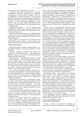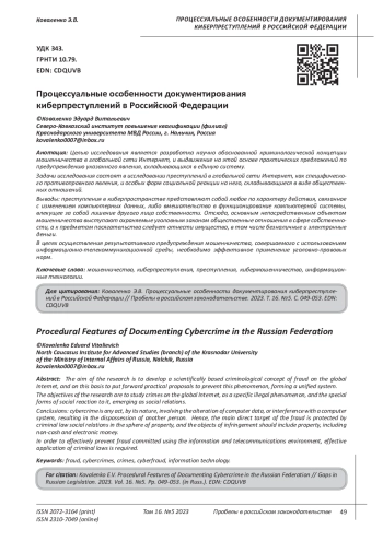 Целью данной статьи является рассмотрение способов совершения мошенничества, которые представляют особый интерес, поскольку их разнообразие открывает широкие «перспективы» для изучения, в том числе следователями, ведущими расследования дел данной категории. Масштабы деятельности преступников раскрываются именно посредством способа совершения, поскольку его эффективность позволяет получить максимальную прибыль, а легальный, на первый взгляд, характер этой деятельности дает возможность длительного ее существования. Авторы приводят различные классификации, предложенные правоведами разных периодов времени, поскольку наблюдаются разные тенденции в способах мошенничества. Сегодня наблюдается рост мошенничества в сфере компьютерных и интернет-технологий, взломы аккаунтов и личных кабинетов онлайн-банков. А какие-то 20 лет назад мошенники не гнушались продажей подделок антиквариата, драгоценностей и т. п. При этом «забытые» виды мошенничества периодически «вспоминаются» и сегодня, и обычные люди легко поддаются на эти схемы. Выводы: Широкий спектр способов совершения мошенничества позволяет преступникам «орудовать» как на рынке вещевом, так и на финансовом. Амбиции отдельных лиц настолько велики, что мошенничество совершается в особо крупных размерах, а пострадавшими начинают выступать уже тысячи людей, примером чего являются жертвы финансовых пирамид, обманутые дольщики и пр. Нередко потерпевшими выступают даже известные люди, артисты, которые попадаются на покупке поддельных драгоценностей или брендовых вещей. Мошенники не гнушаются даже тем, что готовы лишить людей последнего жилья или различных сертификатов, для этого предназначенных, таких как жилищные или материнские. К сожалению, достаточно низкий уровень жизни граждан нашей страны нередко подталкивает их получение легких денег, которые предлагают мошенники поэтому люди «ведутся» на беспроигрышные лотереи, рекламные акции, бесплатное обслуживание, подарки и прочее, где результатом становятся оформление многомиллионных кредитов, и потеря имущества. Отдельного внимания требует мошенничество в сфере цифровых и компьютерных технологий: кардинг, фишинг, блокировка устройств посредством вредоносных рассылок, взлом аккаунтов и банковских приложений - это лишь малая толика способов мошенничества.