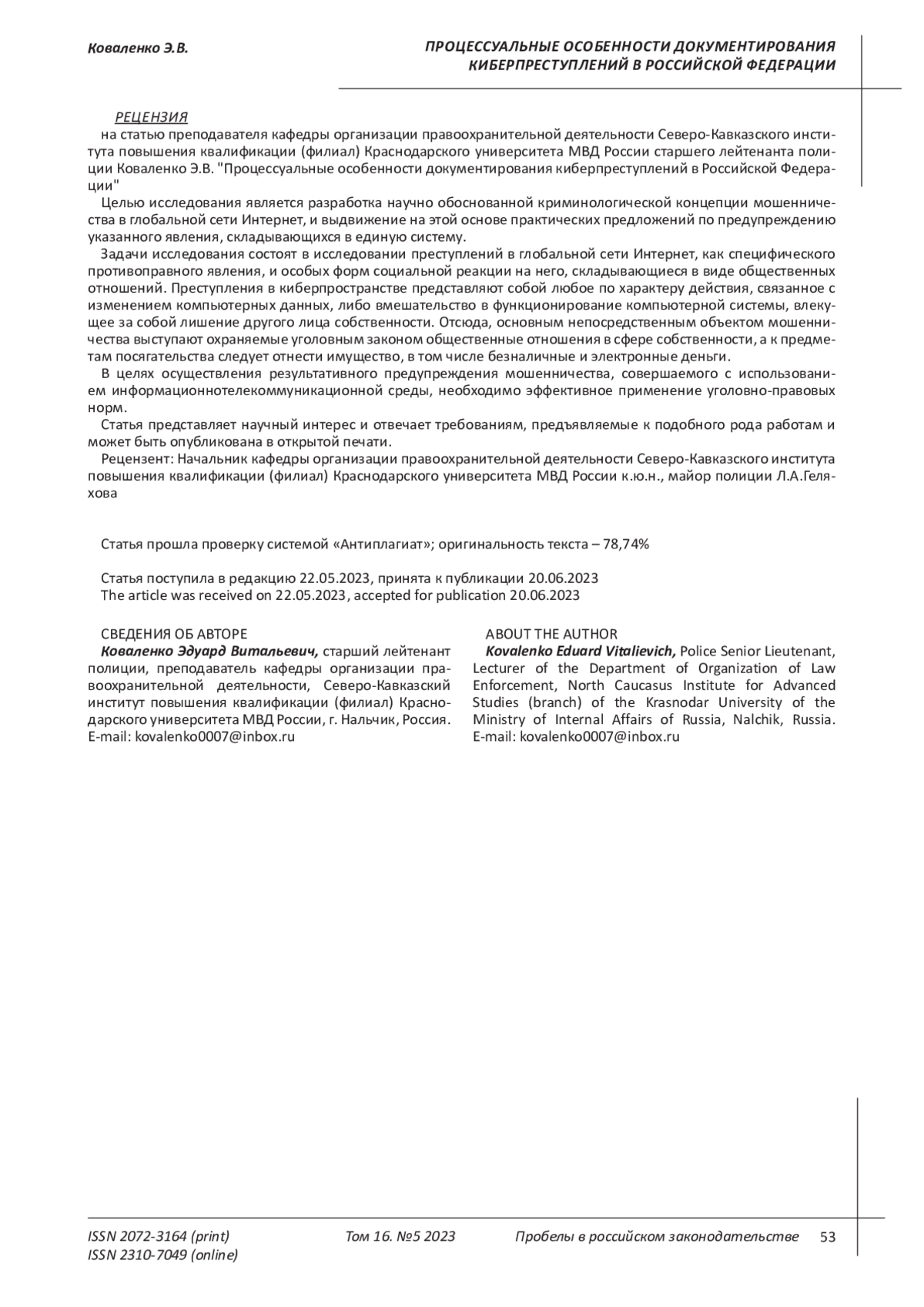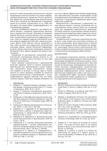 1. 	Петров, С. Совершенствование правовых способов борьбы с мошенничеством [Текст] / С. Петров // Законность. 2018. № 9. С. 43-47. EDN: YVJBNJ