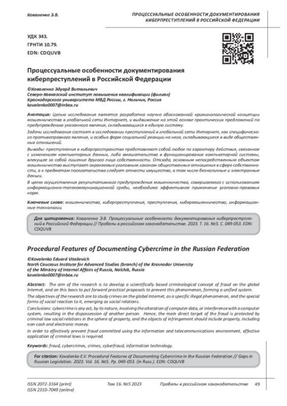 Petrov, S. Improvement of legal methods of combating fraud [Text] / S. Petrov // Legality. 2018. No. 9. P. 43-47. EDN: YVJBNJ