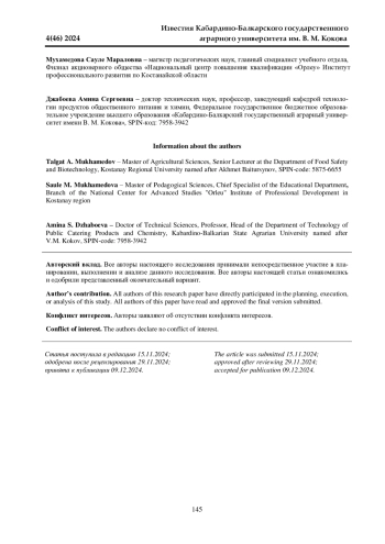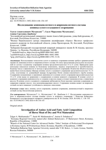 Использование технологии сухого и влажного созревания конины требует сравнительной оценки их аминокислотного и жирнокислотного состава. В статье представлены результаты исследований по сухому и влажному созреванию конины продолжительностью 14 и 21 сутки. Приведены сравнительные показатели конины по белковому компоненту, индексу атерогенности и тромбогенности, йодному числу в зависимости от метода и продолжительности созревания. В качестве объекта исследования были использованы образцы конины сухого и влажного созревания продолжительностью 14, 21 сутки, полученные из длиннейшей мышцы (Longissimus Dorsi) спинно-поясничного отруба конины. Содержание незаменимых и заменимых аминокислот в конине сухого созревания продолжительностью 14 и 21 сутки выше по сравнению с содержанием в конине влажного созревания. В конине сухого и влажного созревания аминокислоты со сладким и вкусом умами уступают аминокислотам с пикантным вкусом. В конине сухого и влажного созревания наблюдаются более высокие значения содержания насыщенных жирных кислот, чем мононенасыщенных кислот. Созревание конины влияет на жирнокислотный состав и повышает устойчивость липидов к окислению.
