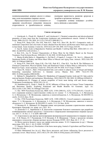 10. Stanisławczyk R., Żurek J., Rudy M., Gil M. Influence of Horse Age on Carcass Tissue Composition and Horsemeat Quality: Exploring Nutritional and Health Benefits for Gourmets. Appl. Sci. 2023;13(20):11293. DOI: 10.3390/app132011293 EDN: YBNHDY
