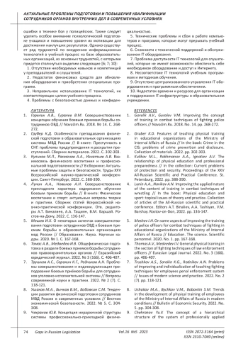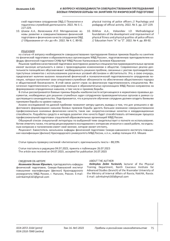 1. 	Горелик А.В., Гуралев В.М. Совершенствование концепции обучения боевым приемам борьбы сотрудников ОВД // NovaUm.Ru. 2018. № 14. С. 268-272. EDN: XYJQPJ