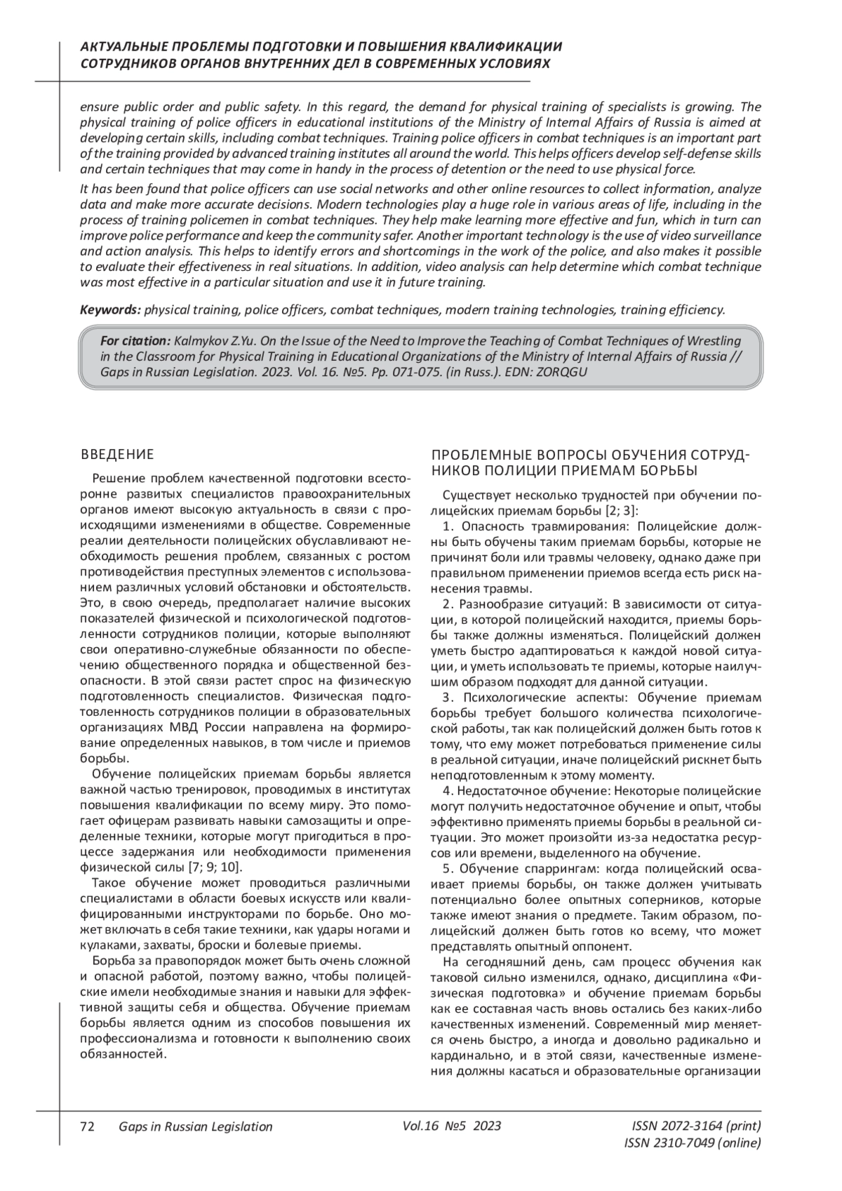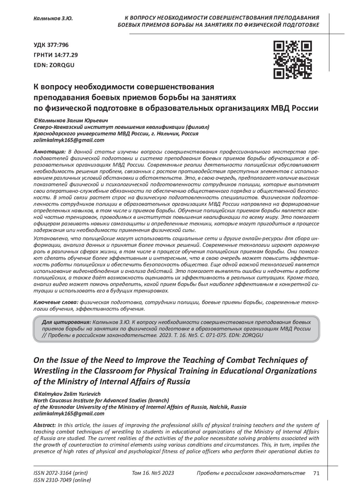 В данной статье изучены вопросы совершенствования профессионального мастерства преподавателей физической подготовки и система преподавания боевых приемов борьбы обучающимся в образовательных организациях МВД России. Современные реалии деятельности полицейских обуславливают необходимость решения проблем, связанных с ростом противодействия преступных элементов с использованием различных условий обстановки и обстоятельств. Это, в свою очередь, предполагает наличие высоких показателей физической и психологической подготовленности сотрудников полиции, которые выполняют свои оперативно-служебные обязанности по обеспечению общественного порядка и общественной безопасности. В этой связи растет спрос на физическую подготовленность специалистов. Физическая подготовленность сотрудников полиции в образовательных организациях МВД России направлена на формирование определенных навыков, в том числе и приемов борьбы. Обучение полицейских приемам борьбы является важной частью тренировок, проводимых в институтах повышения квалификации по всему миру. Это помогает офицерам развивать навыки самозащиты и определенные техники, которые могут пригодиться в процессе задержания или необходимости применения физической силы. Установлено, что полицейские могут использовать социальные сети и другие онлайн-ресурсы для сбора информации, анализа данных и принятия более точных решений. Современные технологии играют огромную роль в различных сферах жизни, в том числе в процессе обучения полицейских приемам борьбы. Они помогают сделать обучение более эффективным и интересным, что в свою очередь может повысить эффективность работы полицейских и обеспечить безопасность общества. Еще одной важной технологией является использование видеонаблюдения и анализа действий. Это помогает выявлять ошибки и недочеты в работе полицейских, а также даёт возможность оценивать их эффективность в реальных ситуациях. Кроме того, анализ видео может помочь определить, какой прием борьбы был наиболее эффективным в конкретной ситуации и использовать его в будущих тренировках.