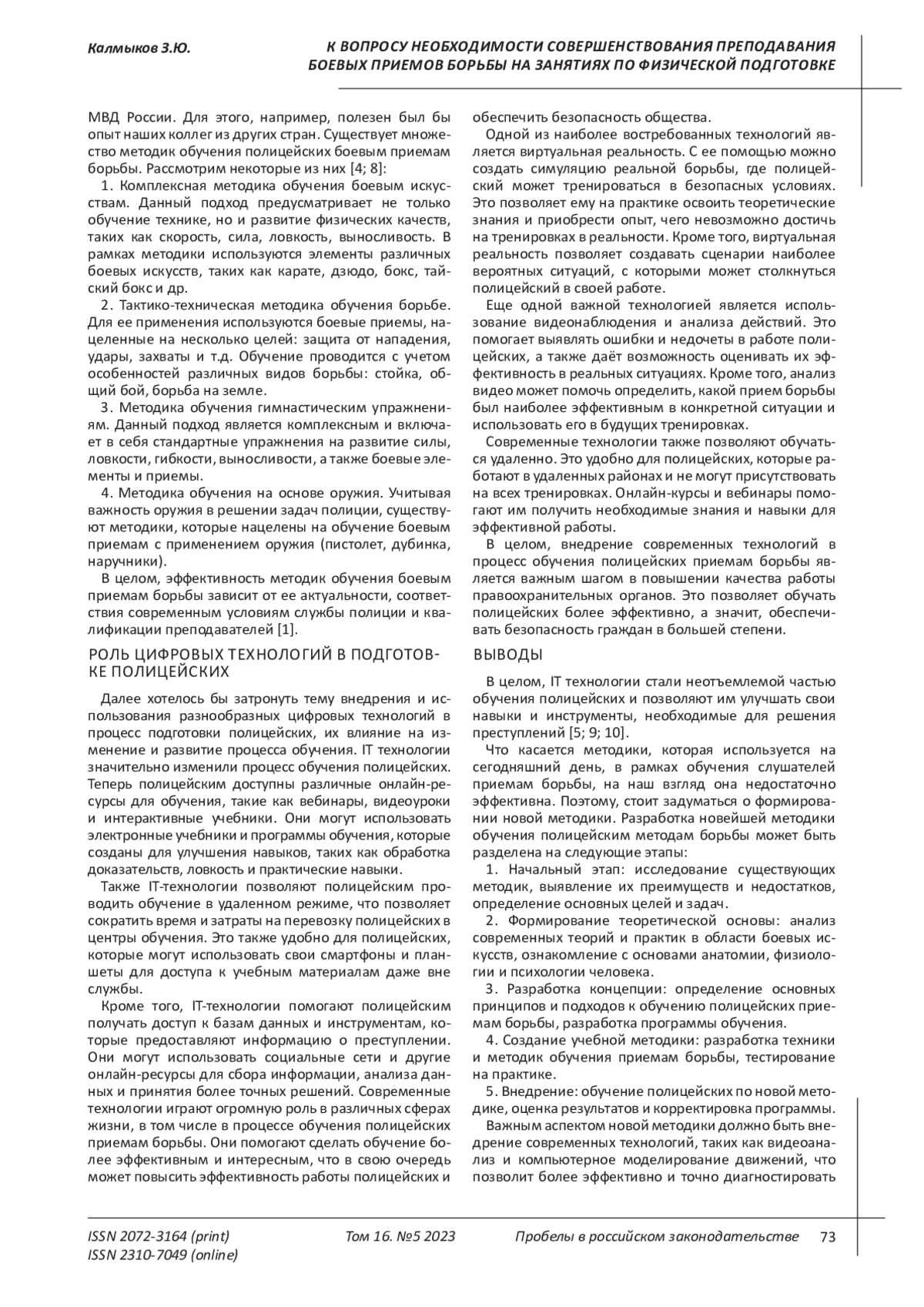 5. 	Мешев И.Х. О некоторых аспектах совершенствования подготовки сотрудников ОВД к боевым приемам борьбы в образовательных организациях мвд России // Образование. Наука. Научные кадры. 2020. № 1. С. 167-168. EDN: OJMAGU