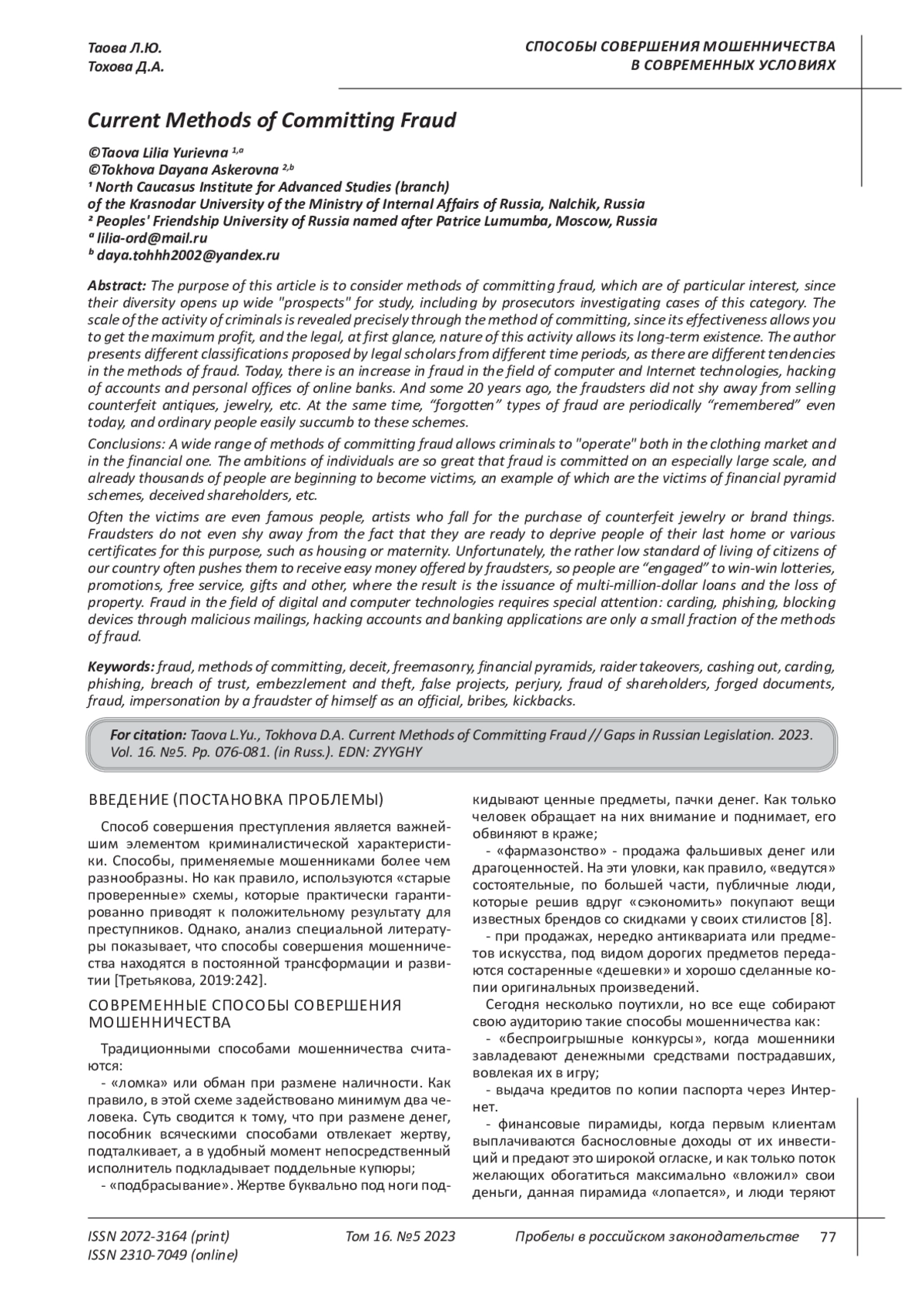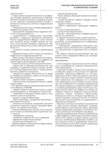 Целью данной статьи является рассмотрение способов совершения мошенничества, которые представляют особый интерес, поскольку их разнообразие открывает широкие «перспективы» для изучения, в том числе следователями, ведущими расследования дел данной категории. Масштабы деятельности преступников раскрываются именно посредством способа совершения, поскольку его эффективность позволяет получить максимальную прибыль, а легальный, на первый взгляд, характер этой деятельности дает возможность длительного ее существования. Авторы приводят различные классификации, предложенные правоведами разных периодов времени, поскольку наблюдаются разные тенденции в способах мошенничества. Сегодня наблюдается рост мошенничества в сфере компьютерных и интернет-технологий, взломы аккаунтов и личных кабинетов онлайн-банков. А какие-то 20 лет назад мошенники не гнушались продажей подделок антиквариата, драгоценностей и т. п. При этом «забытые» виды мошенничества периодически «вспоминаются» и сегодня, и обычные люди легко поддаются на эти схемы. Выводы: Широкий спектр способов совершения мошенничества позволяет преступникам «орудовать» как на рынке вещевом, так и на финансовом. Амбиции отдельных лиц настолько велики, что мошенничество совершается в особо крупных размерах, а пострадавшими начинают выступать уже тысячи людей, примером чего являются жертвы финансовых пирамид, обманутые дольщики и пр. Нередко потерпевшими выступают даже известные люди, артисты, которые попадаются на покупке поддельных драгоценностей или брендовых вещей. Мошенники не гнушаются даже тем, что готовы лишить людей последнего жилья или различных сертификатов, для этого предназначенных, таких как жилищные или материнские. К сожалению, достаточно низкий уровень жизни граждан нашей страны нередко подталкивает их получение легких денег, которые предлагают мошенники поэтому люди «ведутся» на беспроигрышные лотереи, рекламные акции, бесплатное обслуживание, подарки и прочее, где результатом становятся оформление многомиллионных кредитов, и потеря имущества. Отдельного внимания требует мошенничество в сфере цифровых и компьютерных технологий: кардинг, фишинг, блокировка устройств посредством вредоносных рассылок, взлом аккаунтов и банковских приложений - это лишь малая толика способов мошенничества.