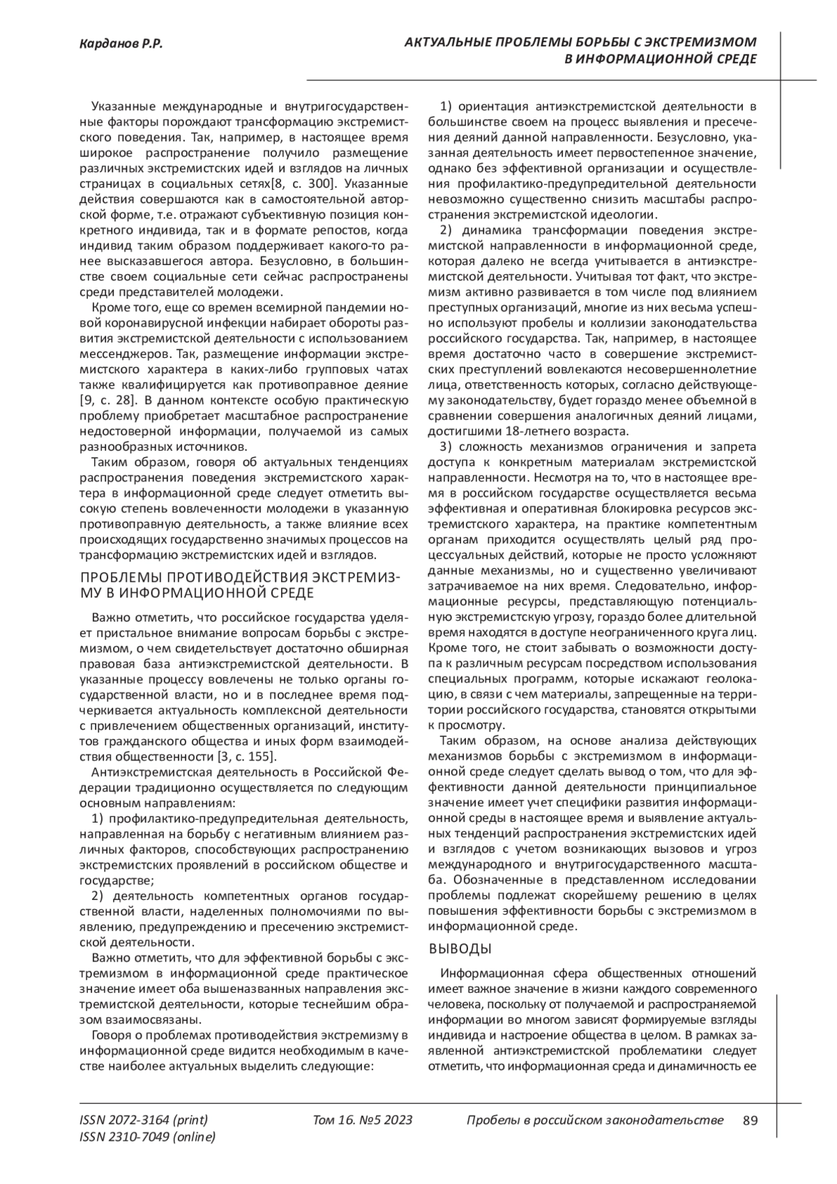 3. Гаврилов Д.А., Гаврилова В.Д. К вопросу о трансформации правовой политики в области противодействия экстремизму и нацизму // Право и практика. 2022. № 2. С. 153-157. EDN: XXNBGO