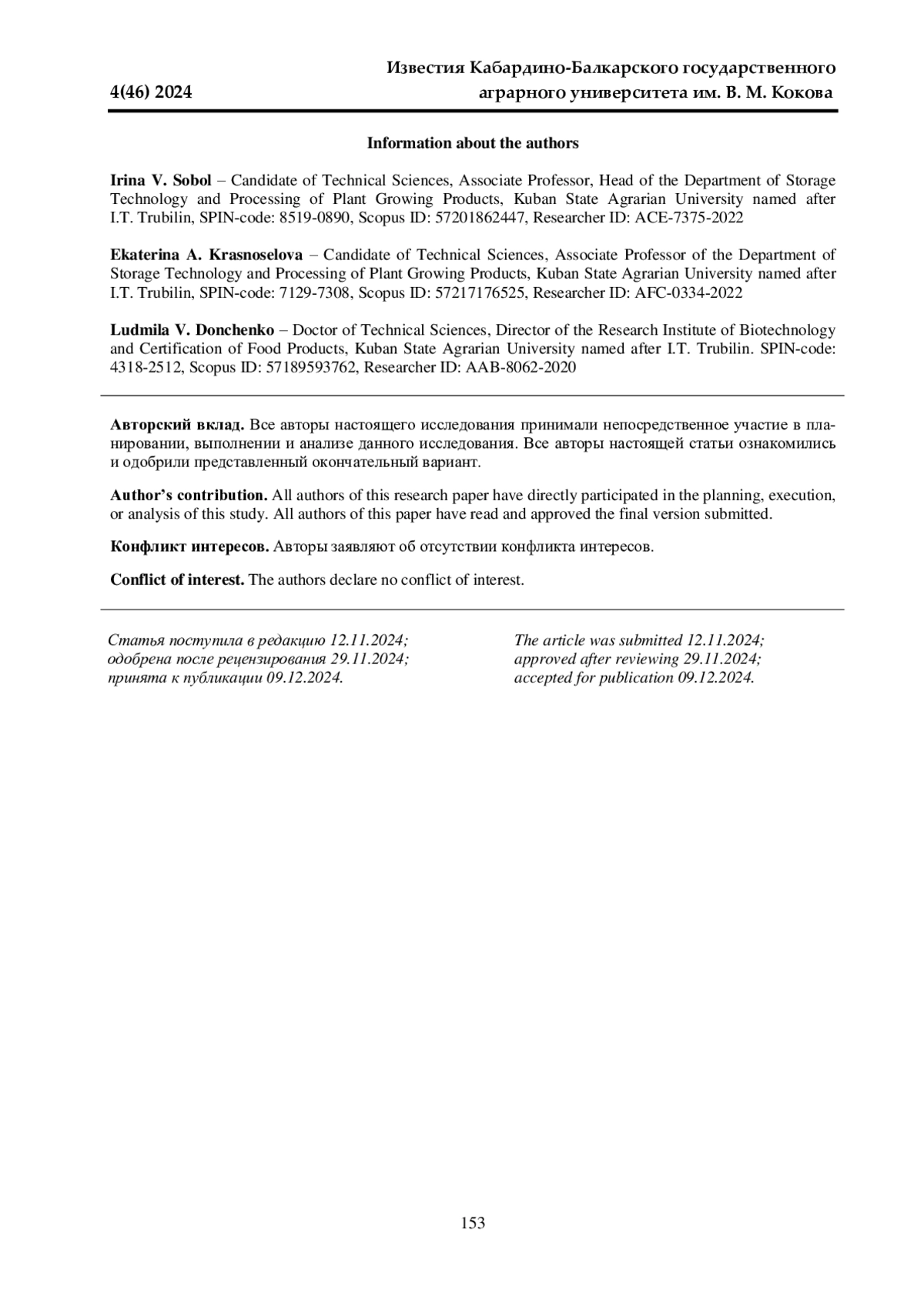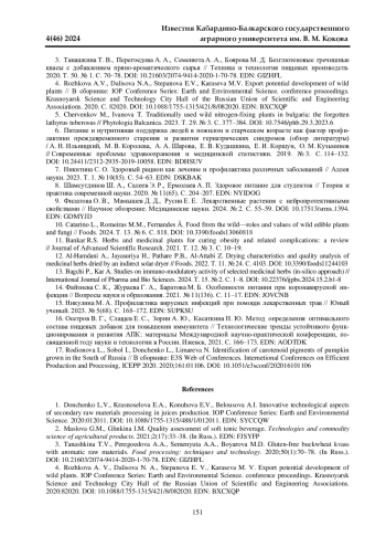 1. Donchenko L.V., Krasnoselova E.A., Konuhova E.V., Belousova A.I. Innovative technological aspects of secondary raw materials processing in juices production // В сборнике: IOP Conference Series: Earth and Environmental Science. 2020. С. 012011. DOI: 10.1088/1755-1315/488/1/012011 EDN: SYCCQW