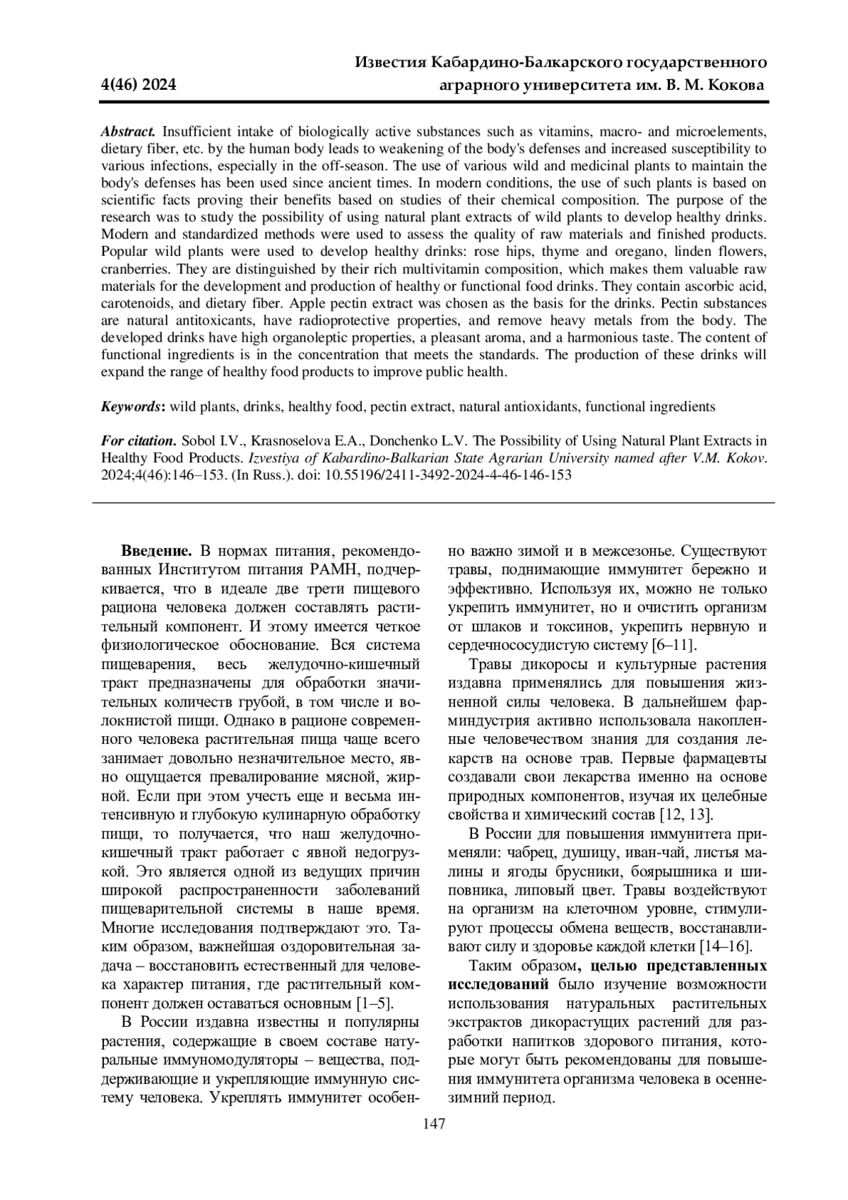 Недостаточное поступление в организм человека биологически активных веществ, таких как витамины, макро- и микроэлементы, пищевые волокна и другие, приводит к ослаблению защитных функций организма, повышенному восприятию к инфекциям различного рода, особенно в межсезонный период. Использование разнообразных дикорастущих и лекарственных растений для поддержания защитных сил организма применялось с древних времен. В современных условиях использование подобных растений опирается на научные факты, доказывающие их пользу на основе исследований химического состава. Целью исследований было изучение возможности использования натуральных растительных экстрактов дикорастущих растений для разработки напитков здорового питания. Для оценки качества сырья и готовой продукции использовали современные и стандартизированные методы. Для разработки напитков для здорового питания были использованы популярные дикорастущие растения: плоды шиповника, трава чабреца и душицы, цветы липы, ягоды клюквы. Они отличаются богатым поливитаминным составом, что делает их ценным сырьем для разработки и производства напитков для здорового или функционального питания. В их составе определены аскорбиновая кислота, каротиноиды, пищевые волокна. В качестве основы для напитков выбрали яблочный пектиновый экстракт. Пектиновые вещества являются натуральными антитоксикантами, обладают радиопротекторными свойствами, выводят из организма тяжелые металлы. Разработанные напитки отмечены высокими органолептическими показателями, имеют приятный аромат и гармоничный вкус. Содержание функциональных ингредиентов находится в соответствующей стандартам концентрации. Производство данных напитков позволит расширить ассортимент продуктов здорового питания для укрепления здоровья населения.