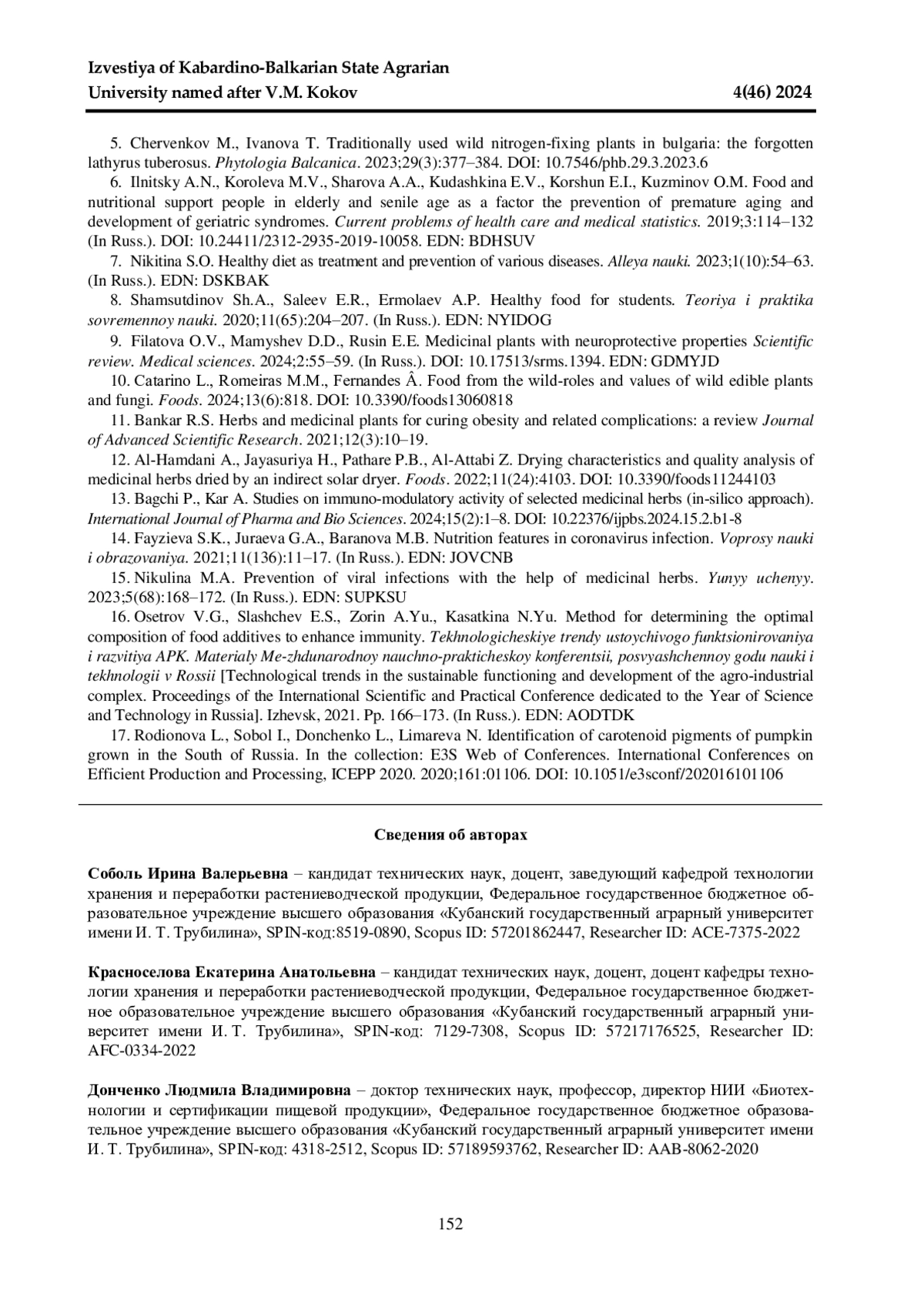 17. Rodionova L., Sobol I., Donchenko L., Limareva N. Identification of carotenoid pigments of pumpkin grown in the South of Russia // В сборнике: E3S Web of Conferences. Internetional Conferences on Efficient Production and Processing, ICEPP 2020. 2020;161:01106. DOI: 10.1051/e3sconf/202016101106 EDN: SXFDGZ