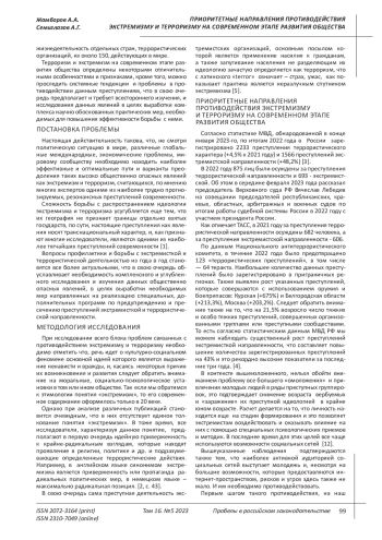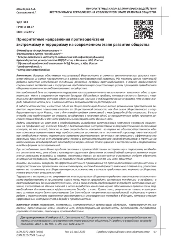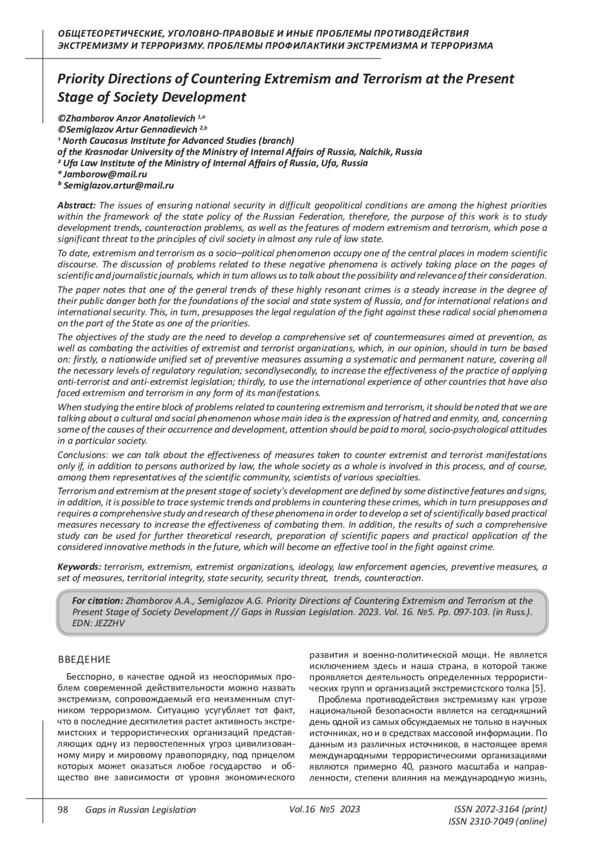 Zhamborov A.A. Modern terrorism and extremism as a potential threat to the security of the state//Gaps in Russian legislation. 2022. Vol. 15. No. 3. pp. 80-86. EDN: SATWXL