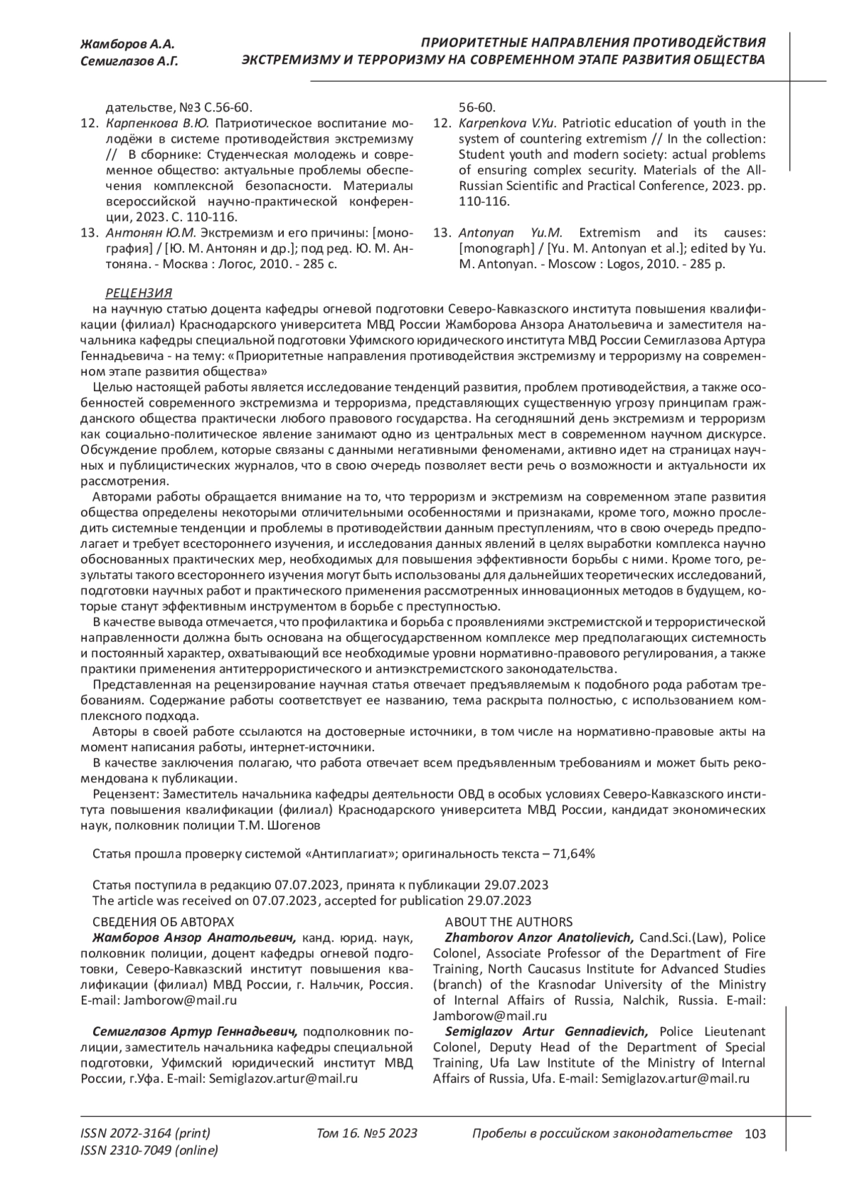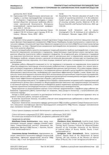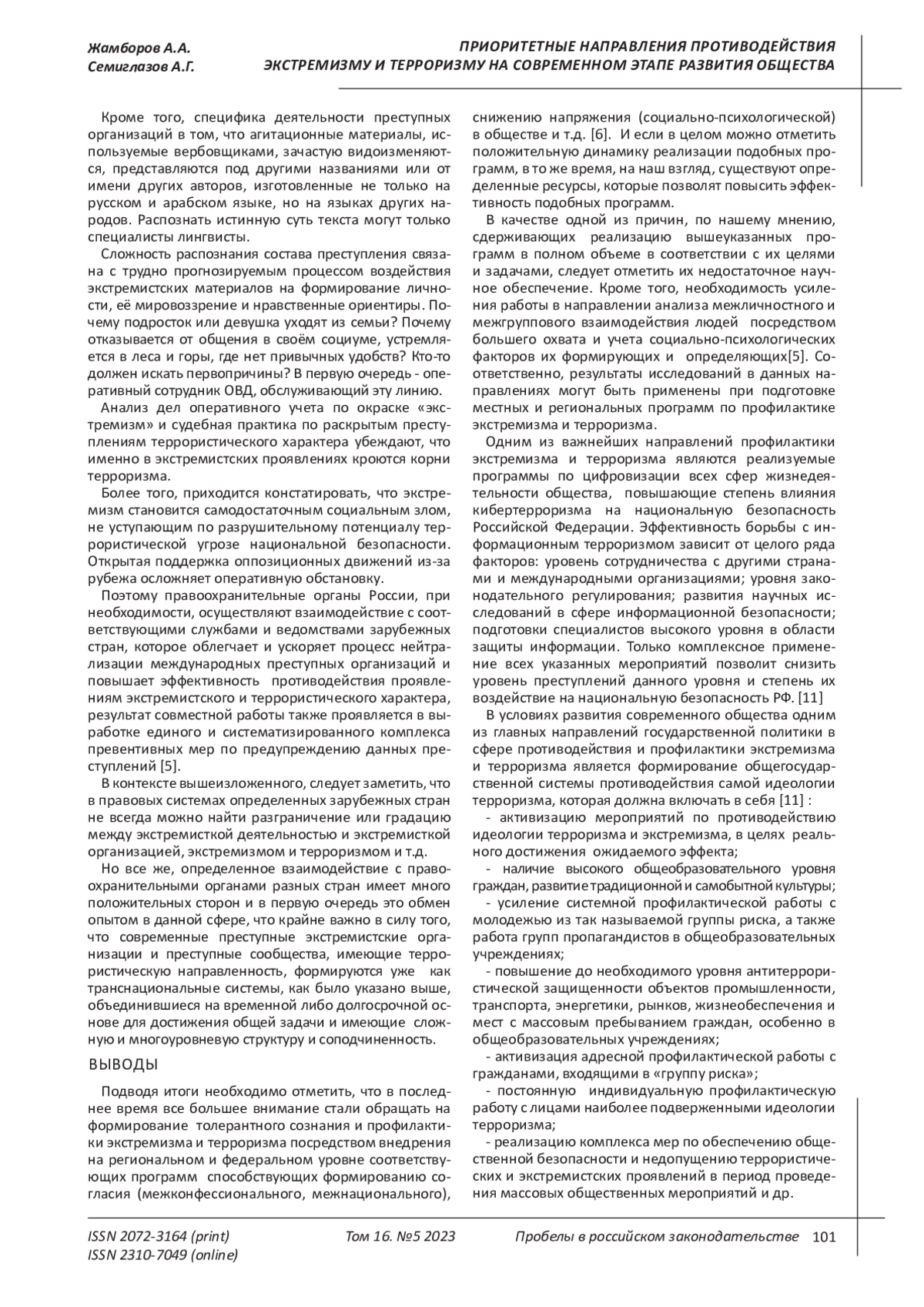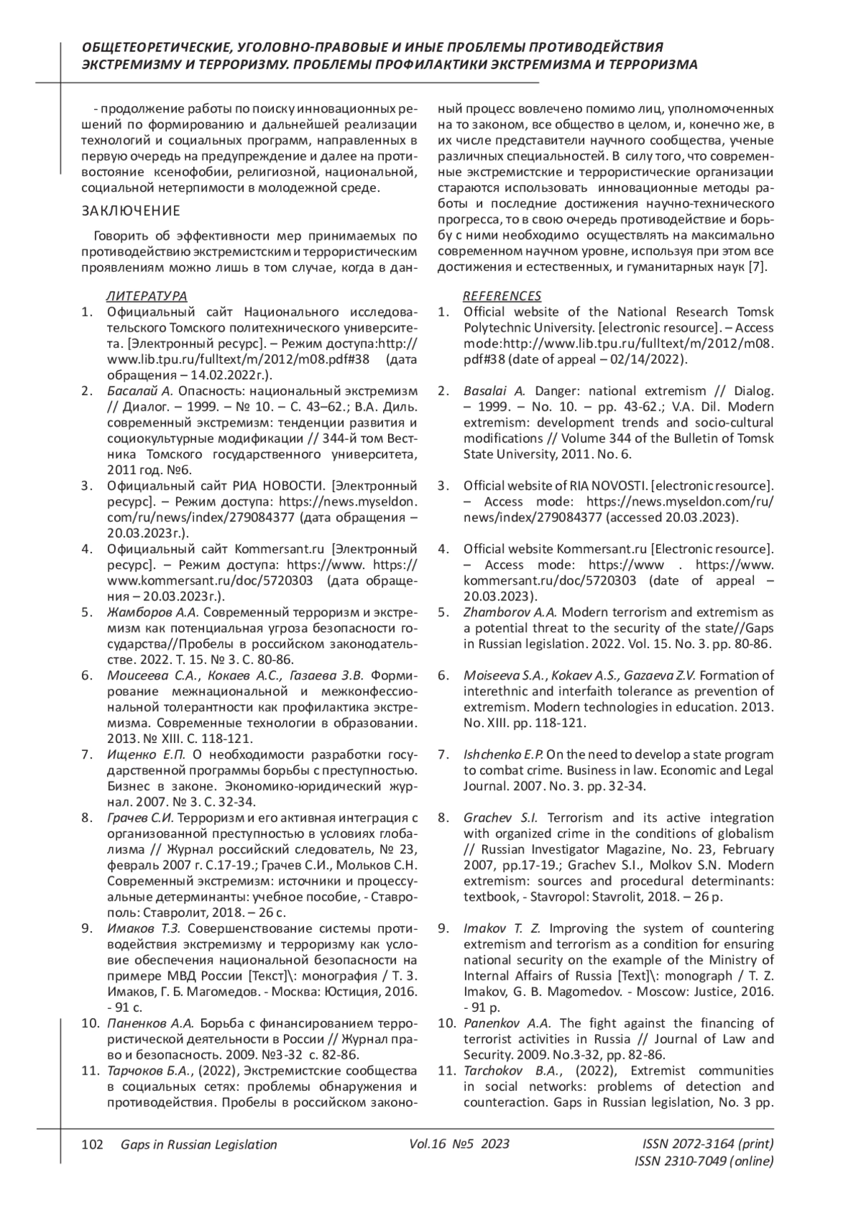 5. 	Жамборов А.А. Современный терроризм и экстремизм как потенциальная угроза безопасности государства//Пробелы в российском законодательстве. 2022. Т. 15. № 3. С. 80-86. EDN: SATWXL