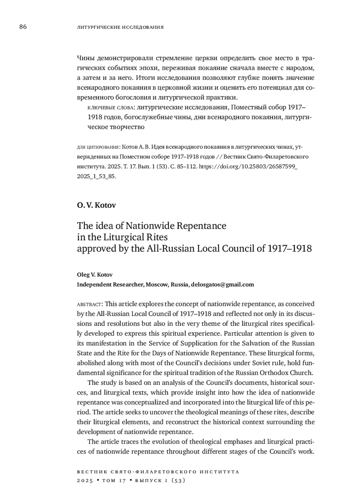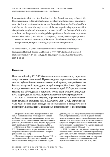 Чины демонстрировали стремление церкви определить свое место в трагических событиях эпохи, переживая покаяние сначала вместе с народом, а затем и за него. Итоги исследования позволяют глубже понять значение всенародного покаяния в церковной жизни и оценить его потенциал для современного богословия и литургической практики.