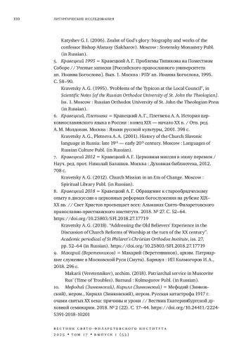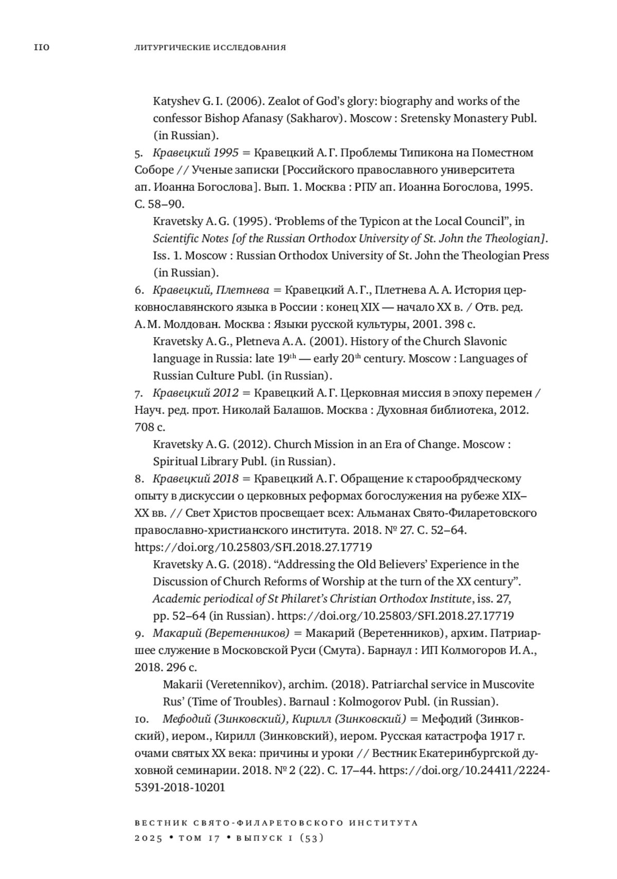 48. 	Кравецкий А. Г. Обращение к старообрядческому опыту в дискуссии о церковных реформах богослужения на рубеже XIX- XX вв. // Свет Христов просвещает всех: Альманах Свято-Филаретовского православно-христианского института. 2018. № 27. С. 52-64. DOI: 10.25803/SFI.2018.27.17719