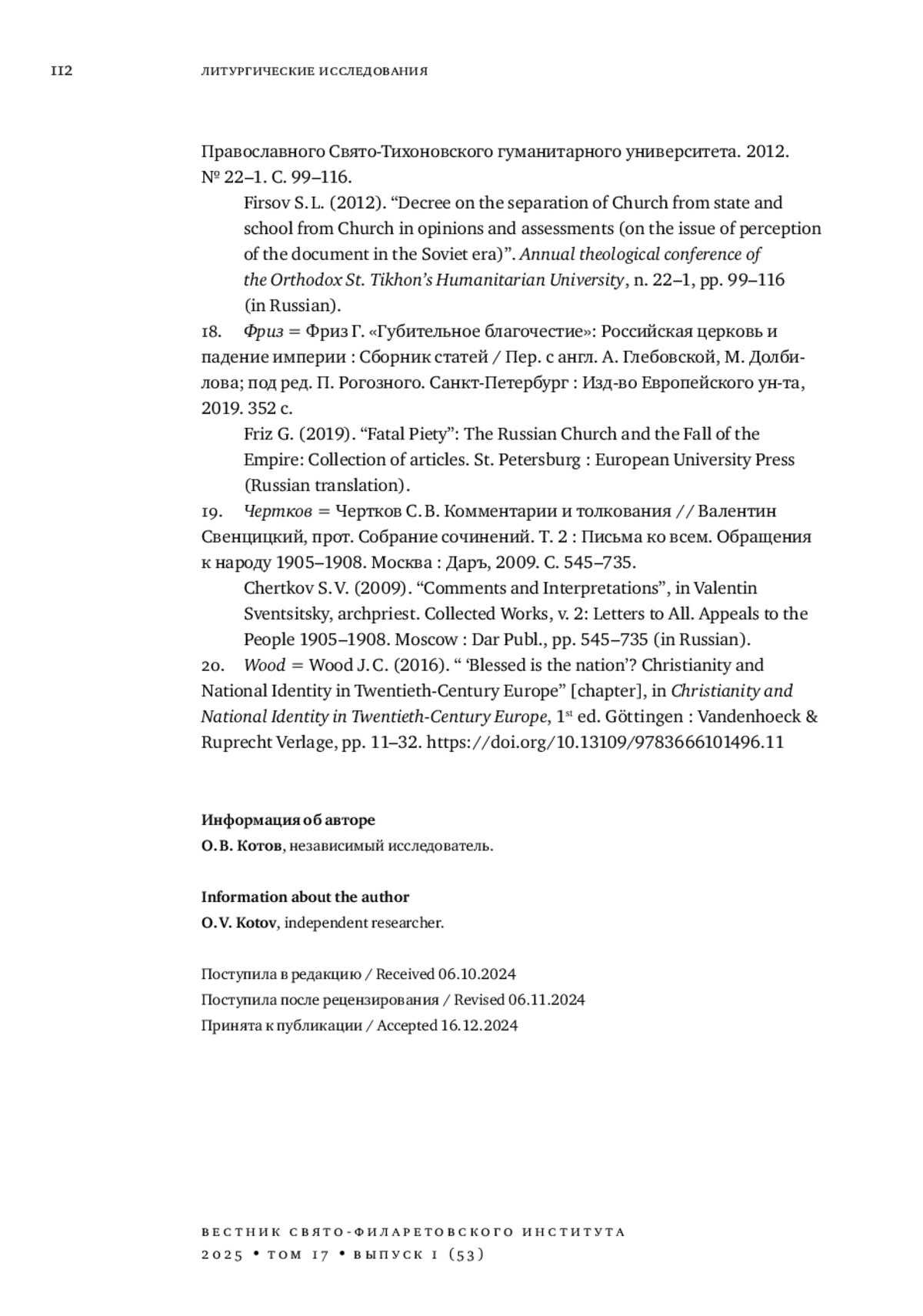 58. 	Фриз Г. “Губительное благочестие”: Российская церковь и падение империи: Сборник статей / Пер. с англ. А. Глебовской, М. Долбилова; под ред. П. Рогозного. Санкт-Петербург: Изд-во Европейского ун-та, 2019. 352 с. EDN: WSLXMU