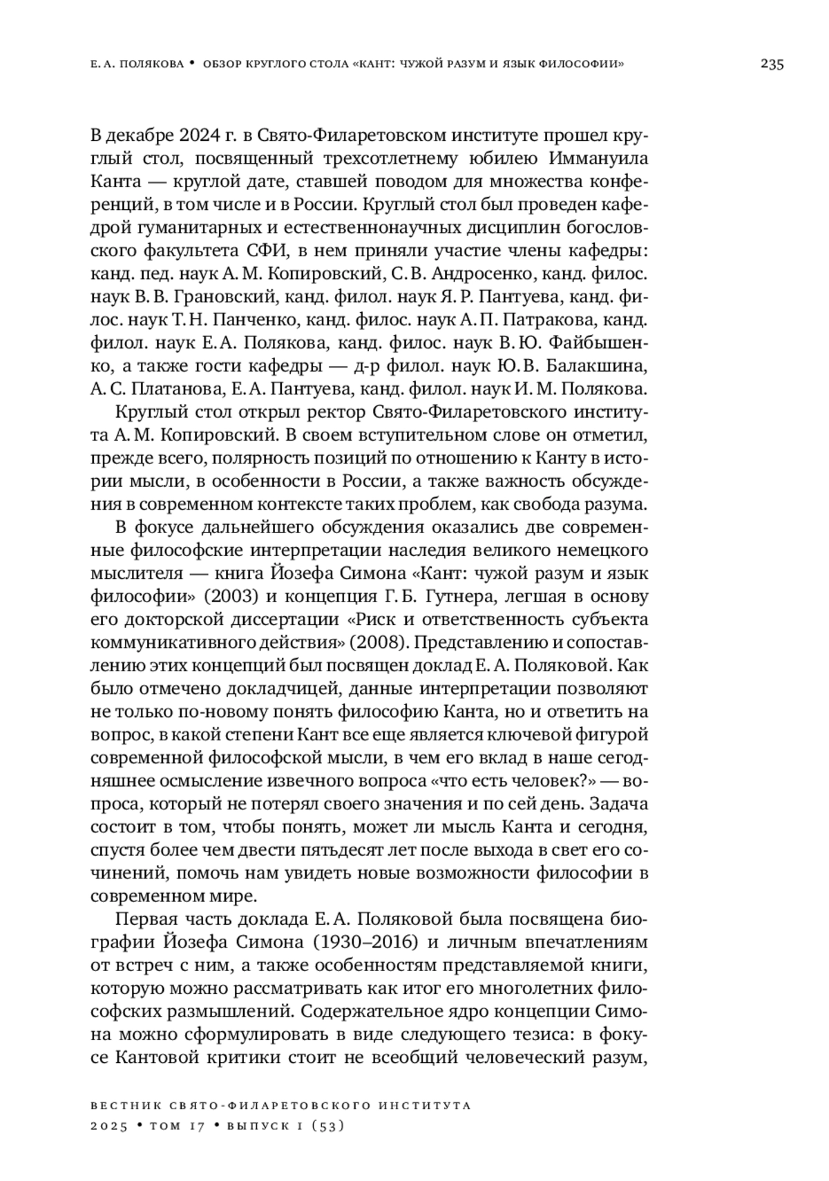 В декабре 2024 г. в Свято-Филаретовском институте прошел круглый стол, посвященный трехсотлетнему юбилею Иммануила Канта — круглой дате, ставшей поводом для множества конференций, в том числе и в России. Круглый стол был проведен кафедрой гуманитарных и естественнонаучных дисциплин богословского факультета СФИ, в нем приняли участие члены кафедры: канд. пед. наук А. М. Копировский, С. В. Андросенко, канд. филос. наук В. В. Грановский, канд. филол. наук Я. Р. Пантуева, канд. филос. наук Т. Н. Панченко, канд. филос. наук А. П. Патракова, канд. филол. наук Е. А. Полякова, канд. филос. наук В. Ю. Файбышенко, а также гости кафедры — д-р филол. наук Ю. В. Балакшина, А. С. Платанова, Е. А. Пантуева, канд. филол. наук И. М. Полякова.