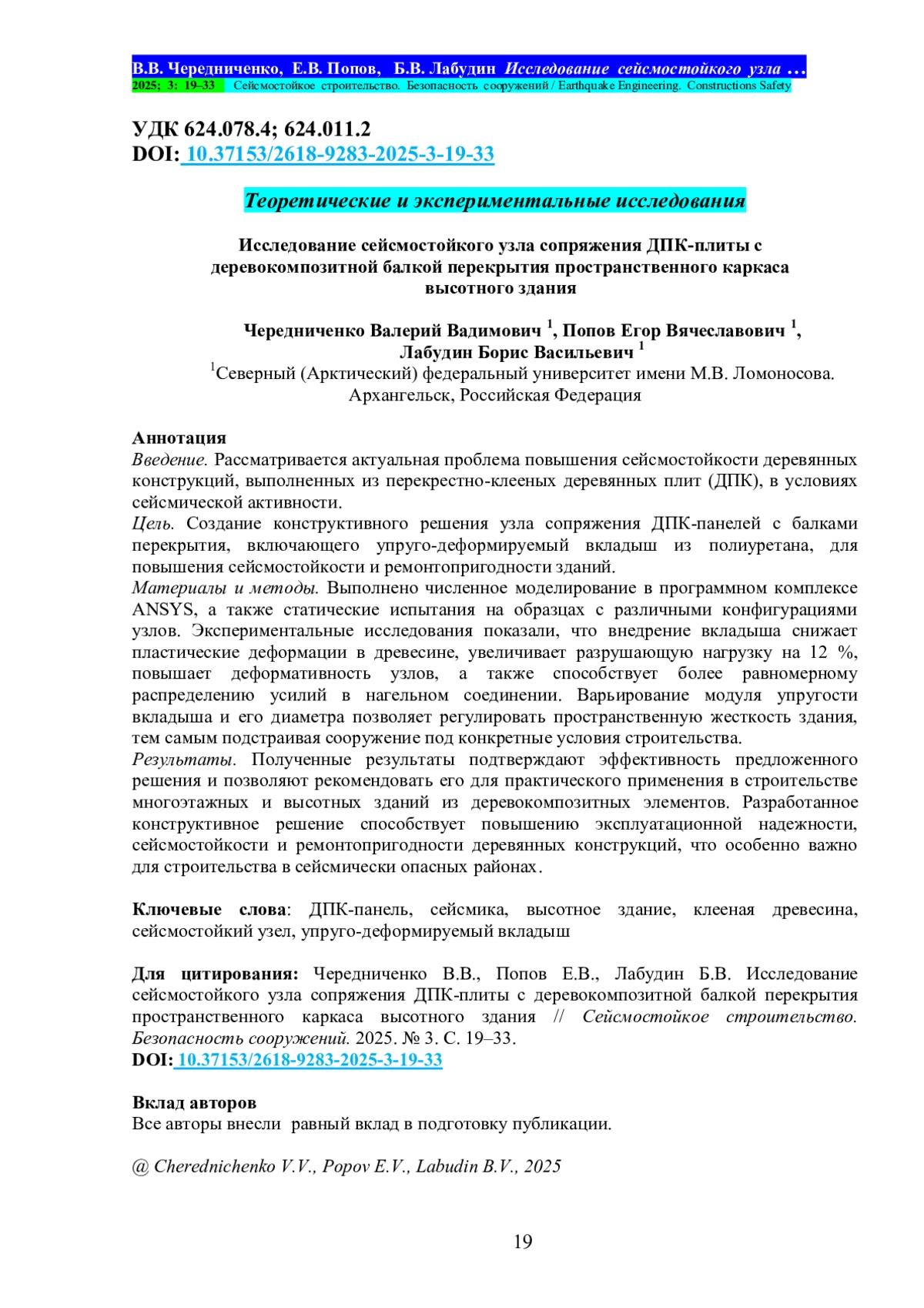 7. Лабудин Б.В., Чередниченко В.В., Карельский А.В., Попов Е.В. Численные исследования конструктивных решений высотных зданий из деревокомпозитных элементов // Известия высших учебных заведений. Строительство. 2024. № 6(786). С. 29-40.