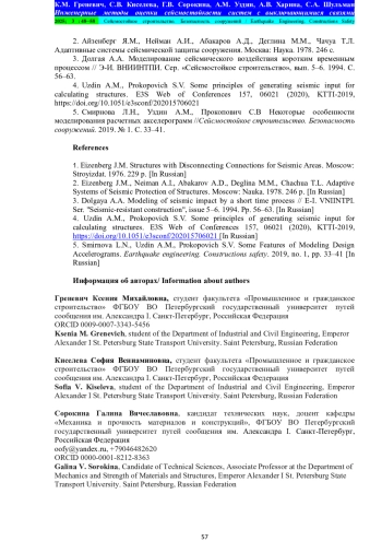 5. Смирнова Л.Н., Уздин А.М., Прокопович С.В Некоторые особенности моделирования расчетных акселерограмм //Сейсмостойкое строительство. Безопасность сооружений. 2019. № 1. С. 33-41.