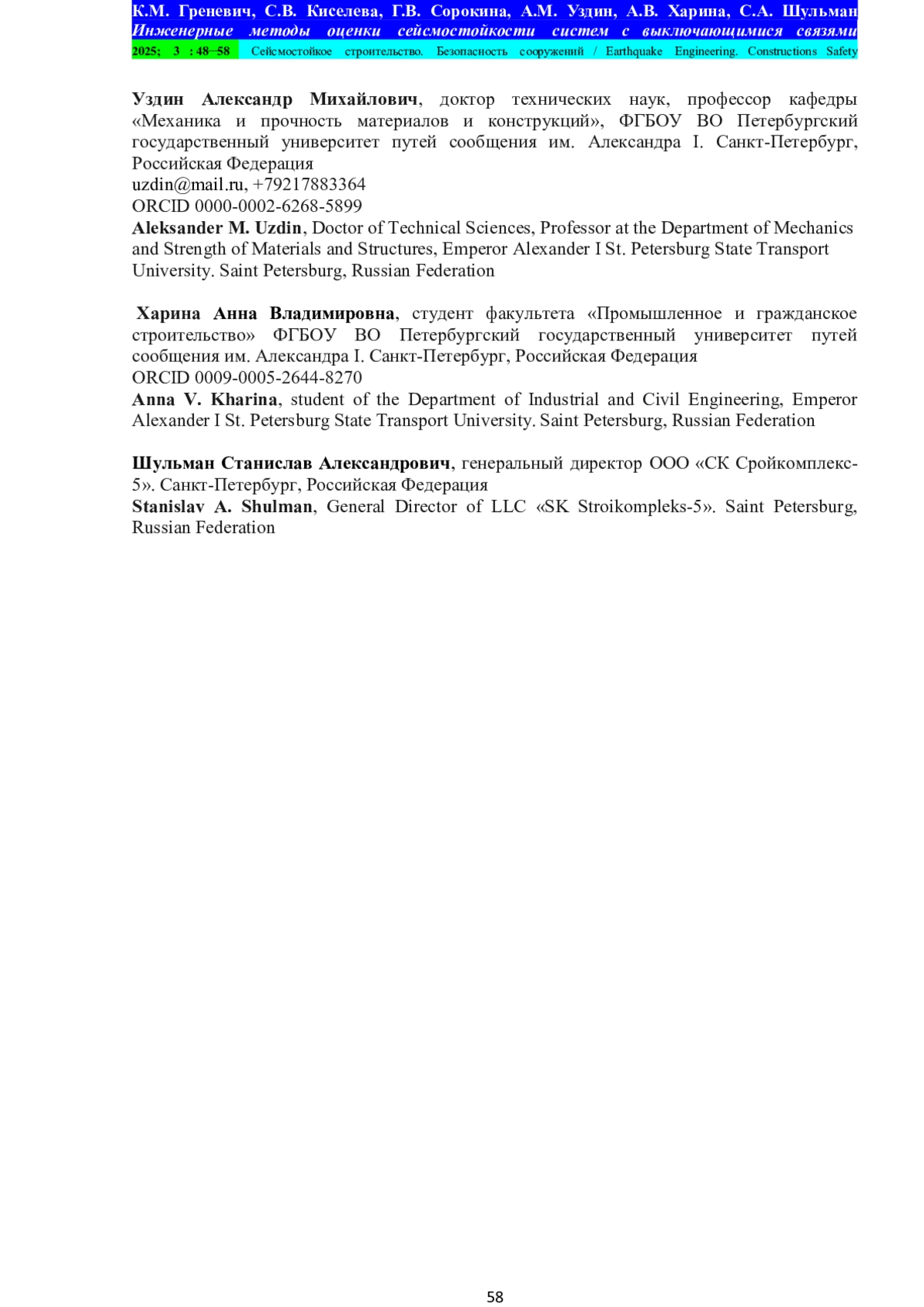 4. Uzdin A.M., Prokopovich S.V. Some principles of generating seismic input for calculating structures. E3S Web of Conferences 157, 06021 (2020), KTTI-2019,. DOI: 10.1051/e3sconf/202015706021