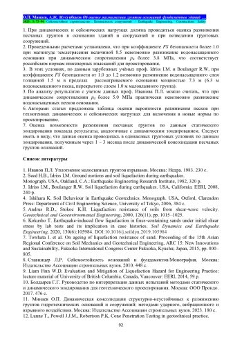 Ключевые фразы: разжижение грунтов, ОСНОВАНИЯ, песчаные грунты, фундаменты, оценка, магнитуда землетрясений, коэффициент безопасности, консолидация, зондирование
