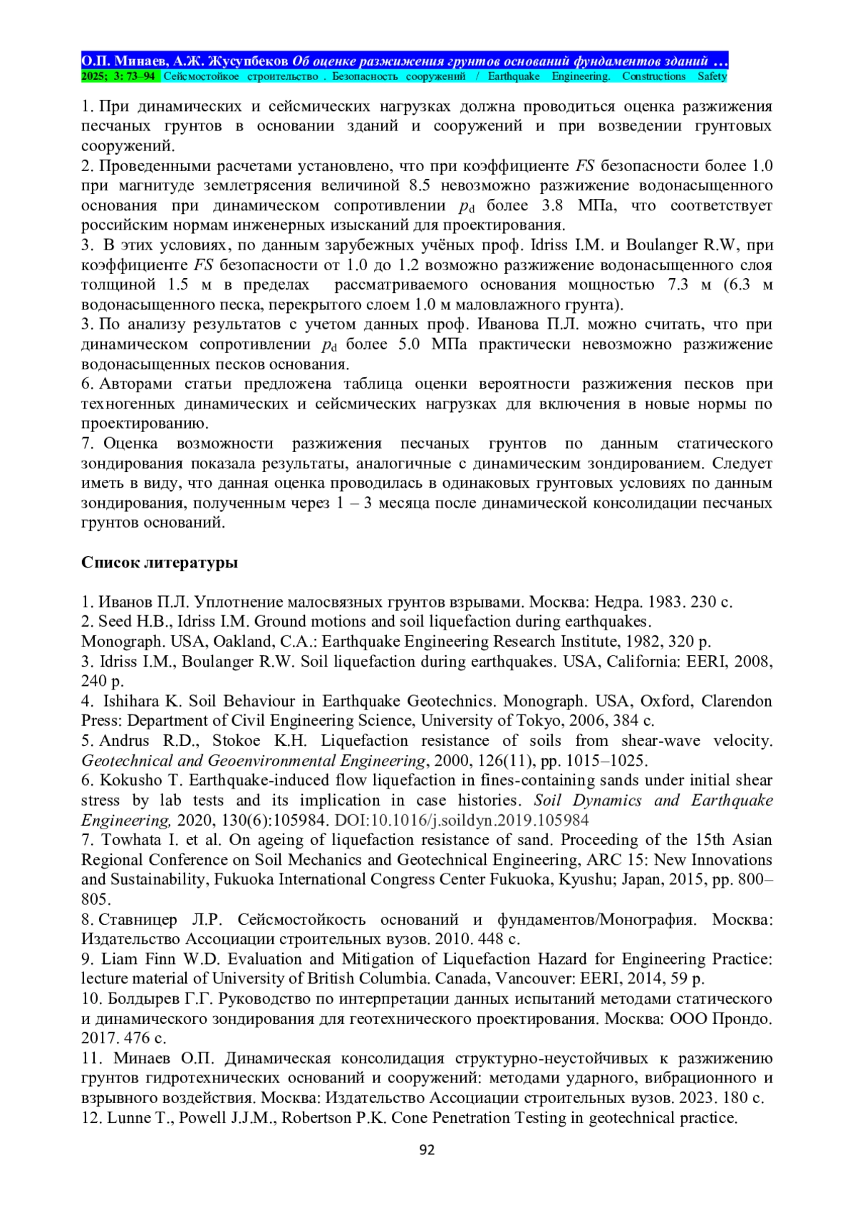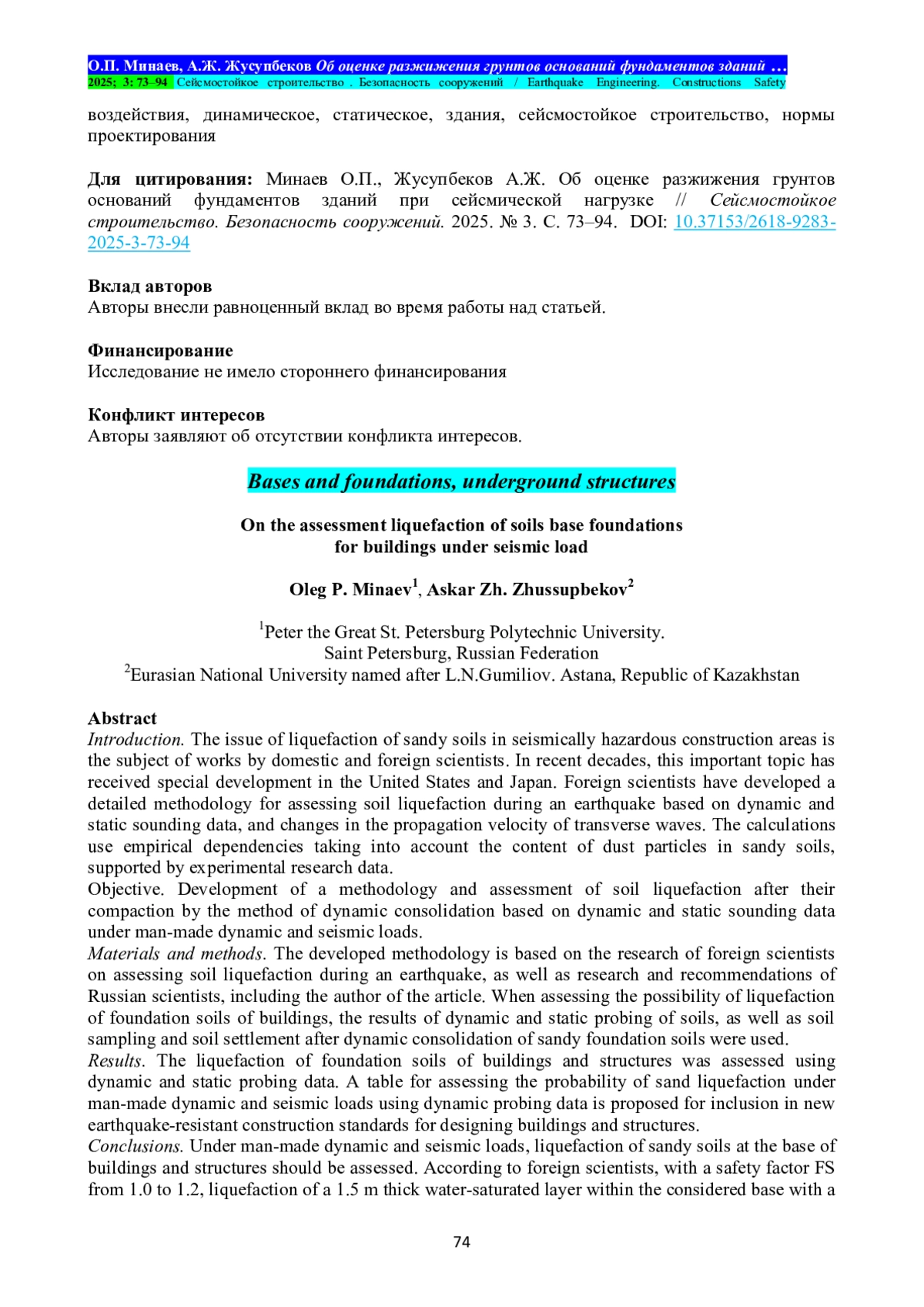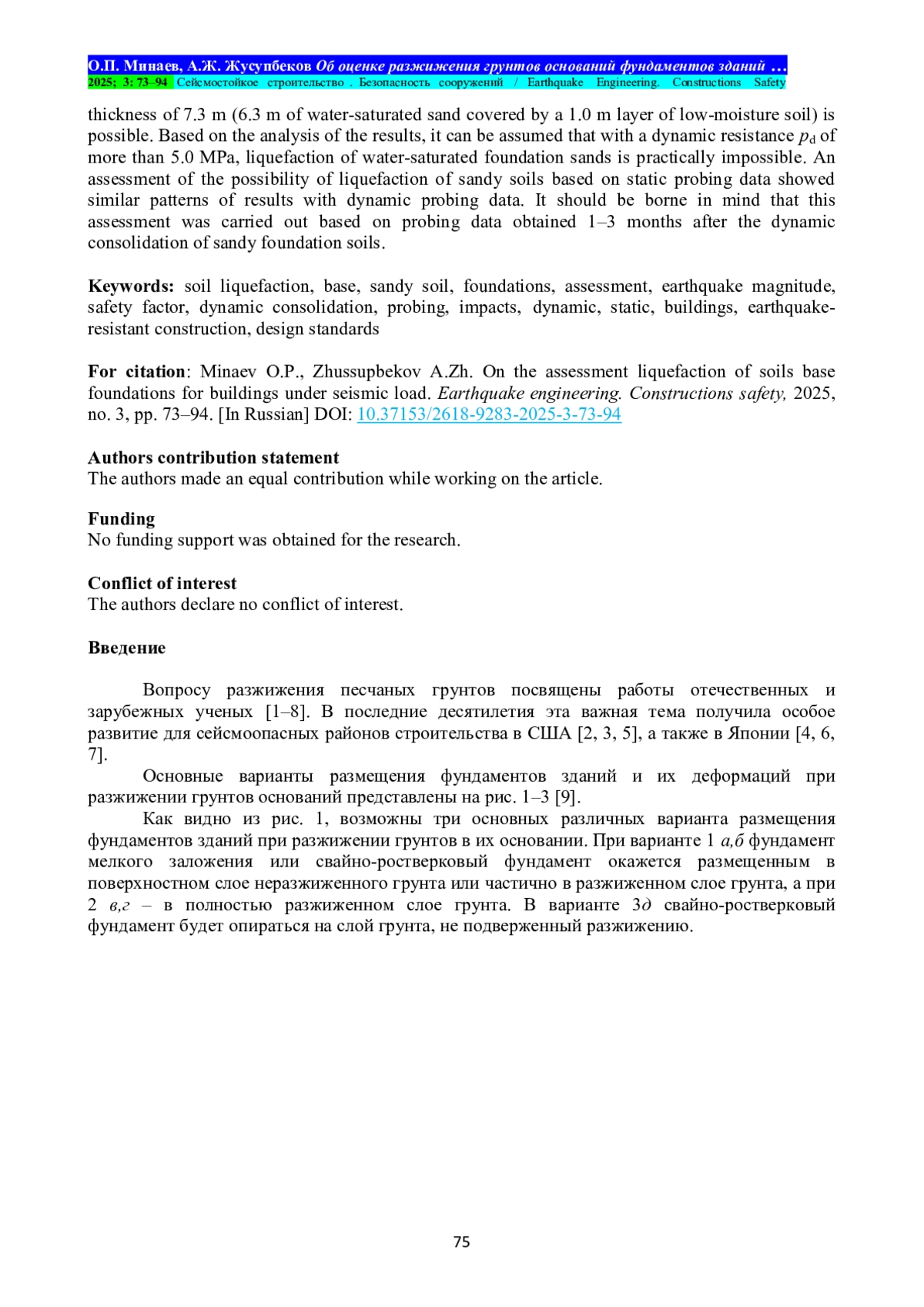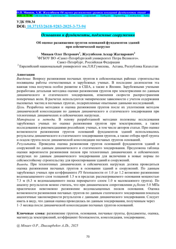 МИНАЕВ О. П., ЖУСУПБЕКОВ А. Ж. ОБ ОЦЕНКЕ РАЗЖИЖЕНИЯ ГРУНТОВ ОСНОВАНИЙ ФУНДАМЕНТОВ ЗДАНИЙ ПРИ СЕЙСМИЧЕСКОЙ НАГРУЗКЕ // СЕЙСМОСТОЙКОЕ СТРОИТЕЛЬСТВО. БЕЗОПАСНОСТЬ СООРУЖЕНИЙ. 2025. № 3