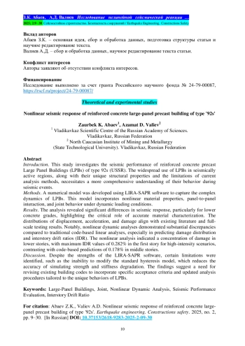 Введение. В статье исследуется сейсмический отклик железобетонного крупнопанельного здания (КПЗ) серии 92с. Широкое использование таких зданий в сейсмически активных районах требует глубокого понимания их поведения во время землетрясений, учитывая их уникальные конструктивные свойства и ограничения существующих методов анализа.