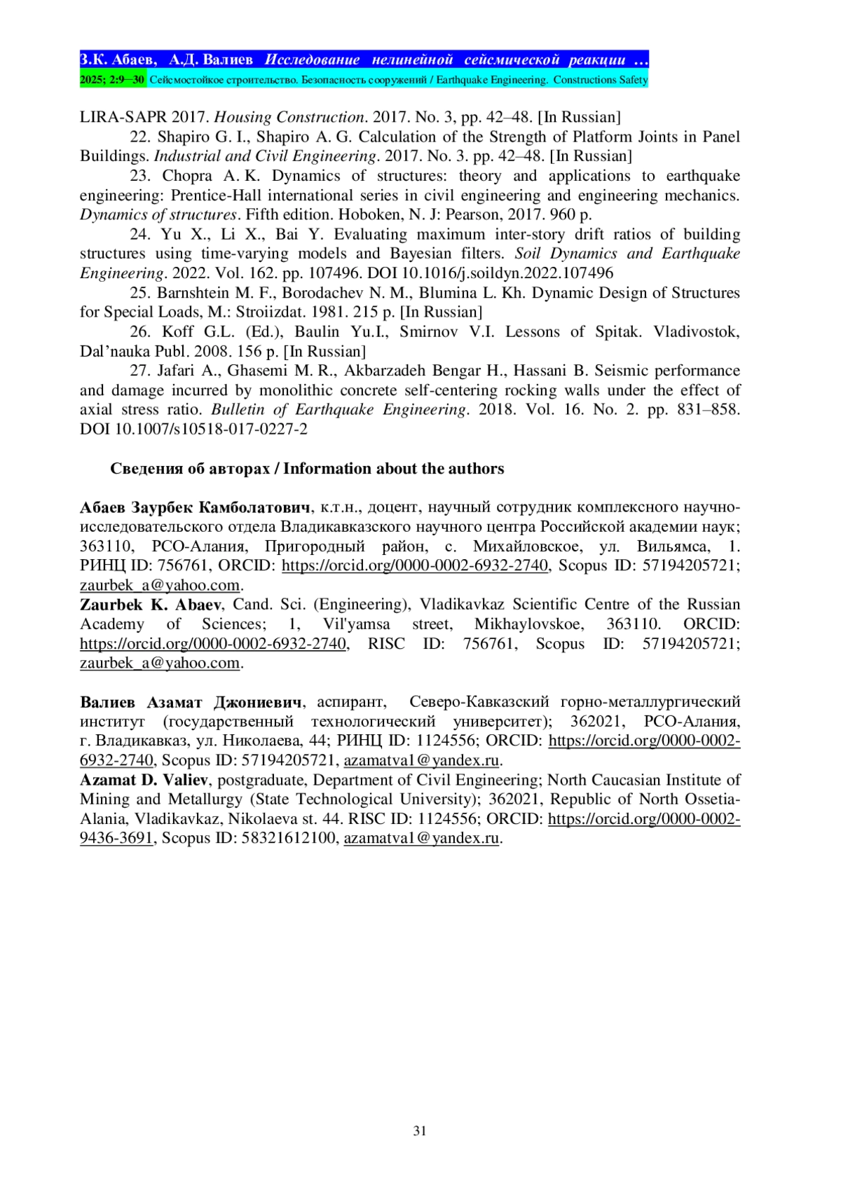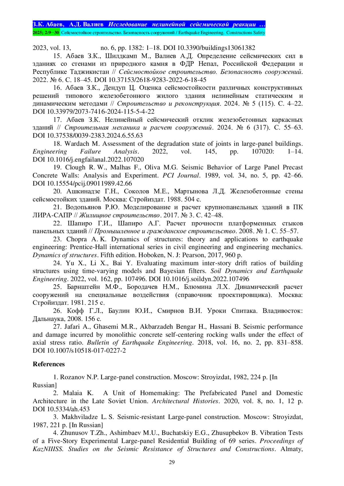 17. Абаев З.К. Нелинейный сейсмический отклик железобетонных каркасных зданий // Строительная механика и расчет сооружений. 2024. № 6 (317). С. 55-63. DOI: 10.37538/0039-2383.2024.6.55.63