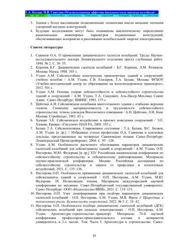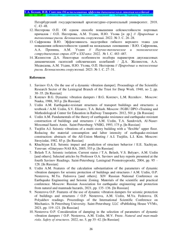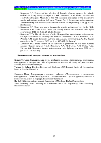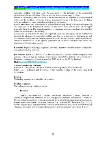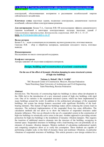 Выводы. Изменение массы подвешенных этажей и жёсткости связей между элементами ствольно-подвесного здания может привести к снижению перемещений и ускорений несущих конструкций, гашению колебаний системы. Дальнейшие исследования могут быть посвящены аналитическому определению оптимальных параметров подвешенных конструкций, обеспечивающих восприятие и рассеивание колебательной энергии сейсмического воздействия.