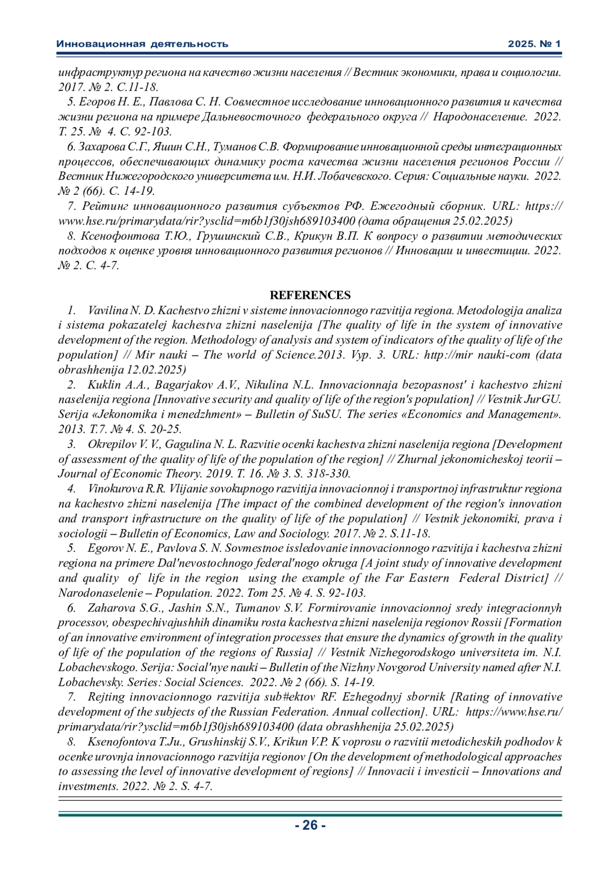 1. 	Вавилина Н. Д. Качество жизни в системе инновационного развития региона. Методология анализа и система показателей качества жизни населения // Мир науки. 2013. Вып.3. URL: http://mirnauki-com (дата обращения 12.02.2025).