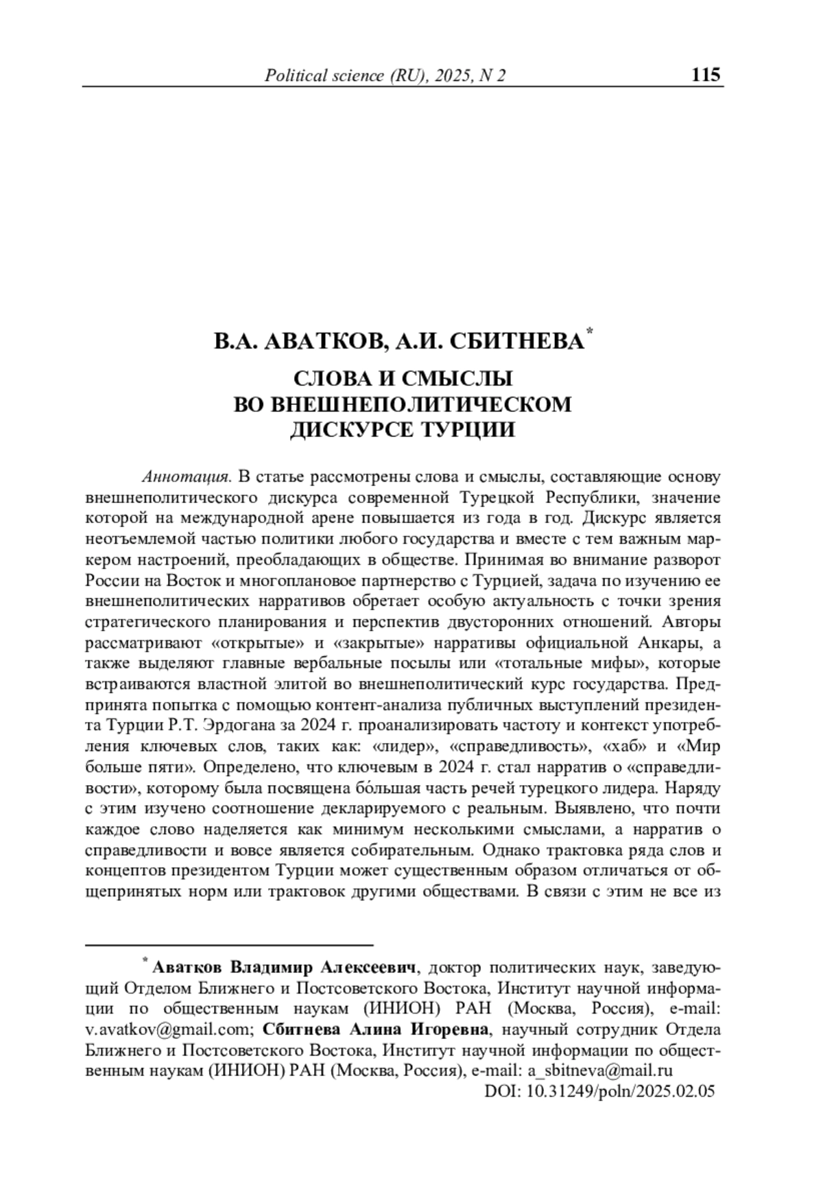 В статье рассмотрены слова и смыслы, составляющие основу внешнеполитического дискурса современной Турецкой Республики, значение которой на международной арене повышается из года в год. Дискурс является неотъемлемой частью политики любого государства и вместе с тем важным маркером настроений, преобладающих в обществе. Принимая во внимание разворот России на Восток и многоплановое партнерство с Турцией, задача по изучению ее внешнеполитических нарративов обретает особую актуальность с точки зрения стратегического планирования и перспектив двусторонних отношений. Авторы рассматривают «открытые» и «закрытые» нарративы официальной Анкары, а также выделяют главные вербальные посылы или «тотальные мифы», которые встраиваются властной элитой во внешнеполитический курс государства. Предпринята попытка с помощью контент-анализа публичных выступлений президента Турции Р. Т. Эрдогана за 2024 г. проанализировать частоту и контекст употребления ключевых слов, таких как: «лидер», «справедливость», «хаб» и «Мир больше пяти». Определено, что ключевым в 2024 г. стал нарратив о «справедливости», которому была посвящена бо́льшая часть речей турецкого лидера. Наряду с этим изучено соотношение декларируемого с реальным. Выявлено, что почти каждое слово наделяется как минимум несколькими смыслами, а нарратив о справедливости и вовсе является собирательным. Однако трактовка ряда слов и концептов президентом Турции может существенным образом отличаться от общепринятых норм или трактовок другими обществами. В связи с этим не все из них представляются конкурентоспособными относительно дискурсивных элементов внешней среды.
