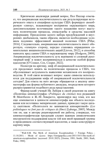 Миф об американской исключительности хотя и подвергается критике и деконструкции, в том числе в академических кругах, по-прежнему продолжает играть важную роль в политических процессах в США, что делает актуальным выявление механизмов его воспроизводства. Настоящее исследование представляет собой попытку внести вклад в приращение научного знания в обозначенной проблемной области посредством ответа на вопрос о том, какие политические символы используются сегодня для поддержания этого мифа. Он, в частности, основывается на представлениях об американской государственности, американских ценностях и американском могуществе. Обращаясь к анализу кинематографа как форме публичного дискурса, авторы выбрали объектом исследования кинокартину «Падение империи» (Civil War). Центральное место в киноленте занимает крушение государственности и могущества США на фоне внутреннего вооруженного конфликта, что делает произведение ценным эмпирическим материалом. Авторы ставят перед собой задачу выявления символов, которые участвуют в воспроизводстве мифа об американской исключительности в рамках выбранного кейса. Теоретико-методологическую базу исследования составляет конструктивизм, основным прикладным методом выступает качественный контент-анализ. Проведенный анализ показал, что посредством демонстрации крушения символов американской государственности и основ экономической, ценностной и военно-политической мощи США транслируется мысль о неизбежности и необходимости поддержания веры в американскую исключительность; отказ от нее равнозначен концу самой нации в нынешнем виде.