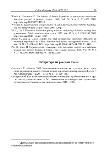 1. Семенов А.В., Минаева Э.Ю. Заимствования политических курсов в сфере городского управления: анализ стратегического городского планирования в России // Ars Administrandi. - 2020. - Т. 12, № 1. - С. 120-136.