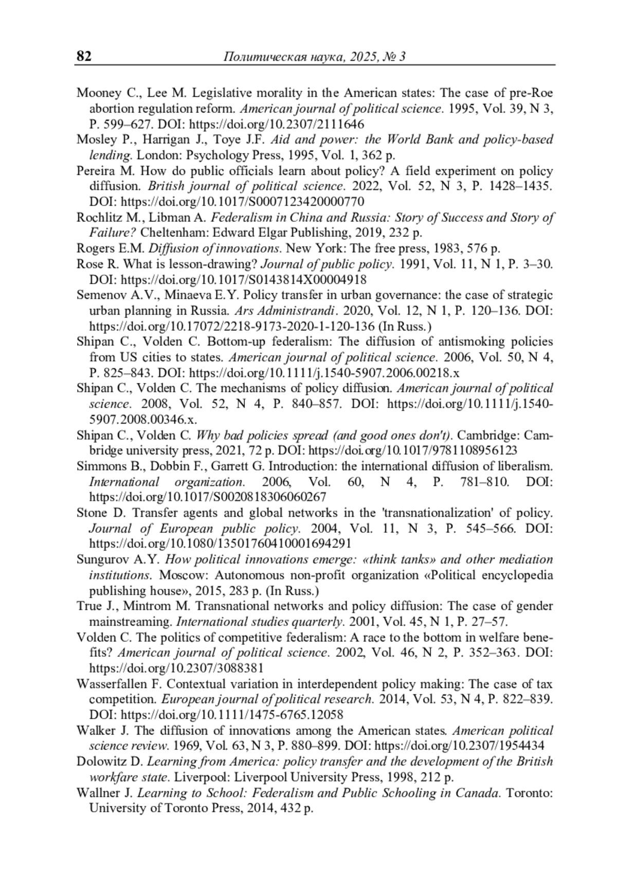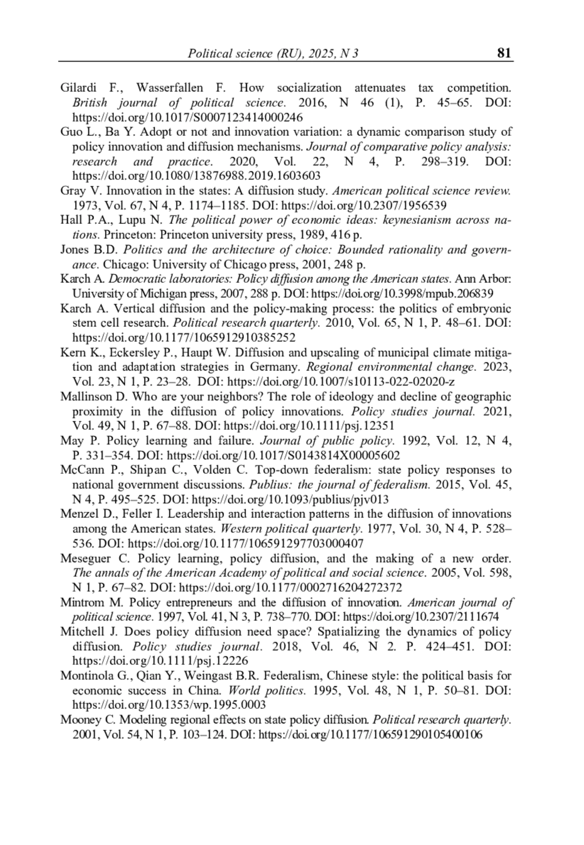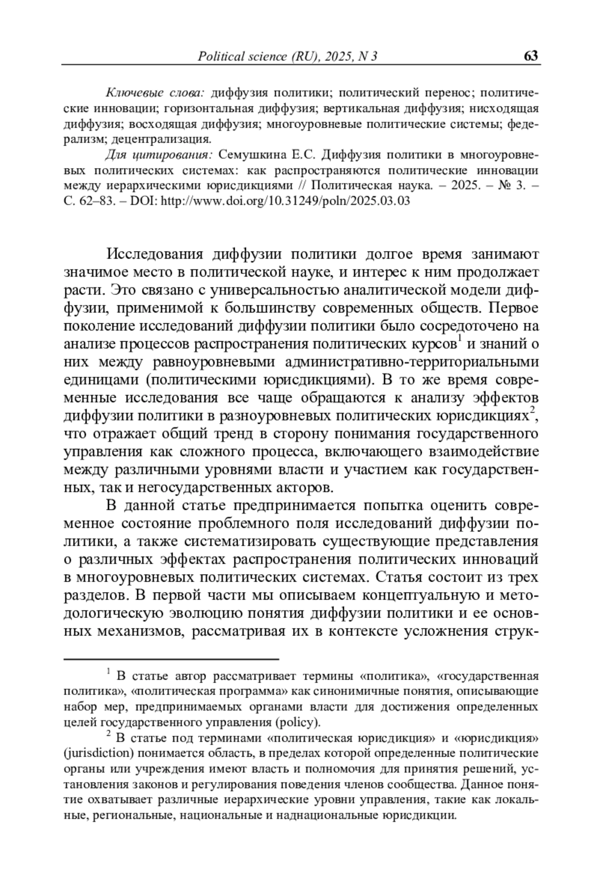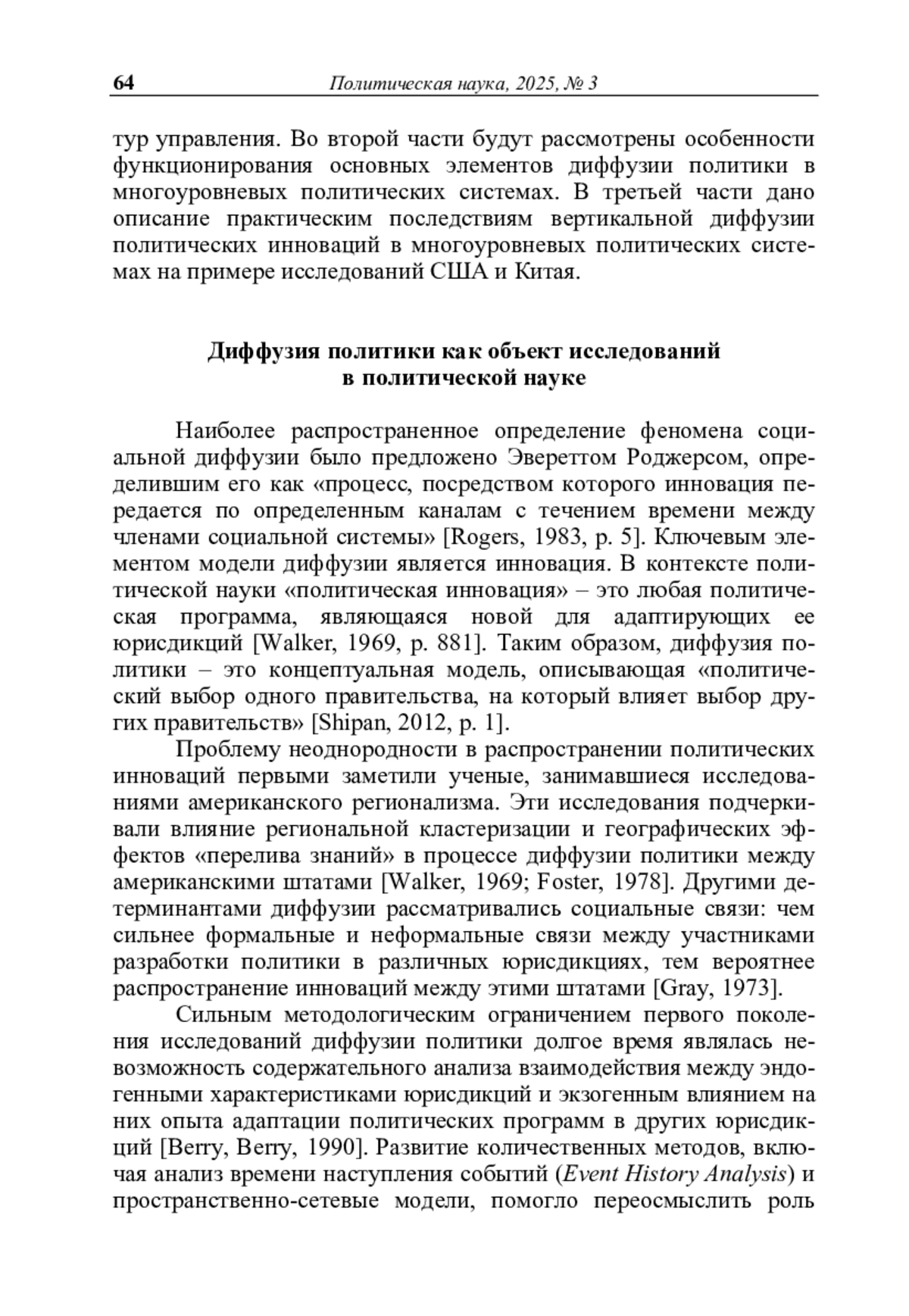 Данная статья представляет собой систематический аналитический обзор исследований, посвященных анализу моделей распространения политических инноваций в многоуровневых политических системах и основных механизмов распространения политики между иерархическими юрисдикциями. Особое внимание уделяется изменению эффектов распространения политических инноваций в контексте трансформации современного поля политической науки и переключению внимания исследователей к системам многоуровневого управления с участием нетрадиционных акторов (multilevel governance). В работе представлен обзор двух основных подходов к теоретической концептуализации процесса распространения политических инноваций – диффузии политики (policy diffusion) и политического трансфера (policy transfer). В первой части исследования рассматривается эволюция указанных теоретических моделей и соответствующих им основных механизмов диффузии. Во второй части исследования определяются ключевые детерминанты диффузии политики – структурные, институциональные и агентские характеристики, дается описание основных каузальных механизмов данных детерминант. Особое внимание уделяется феномену вертикальной диффузии (vertical diffusion) политических инноваций. Заключительная часть статьи посвящена сравнению моделей диффузии политики в западном и незападном политических контекстах на примере сравнительного анализа распространения политических инноваций в многоуровневых политических системах Китая и США.