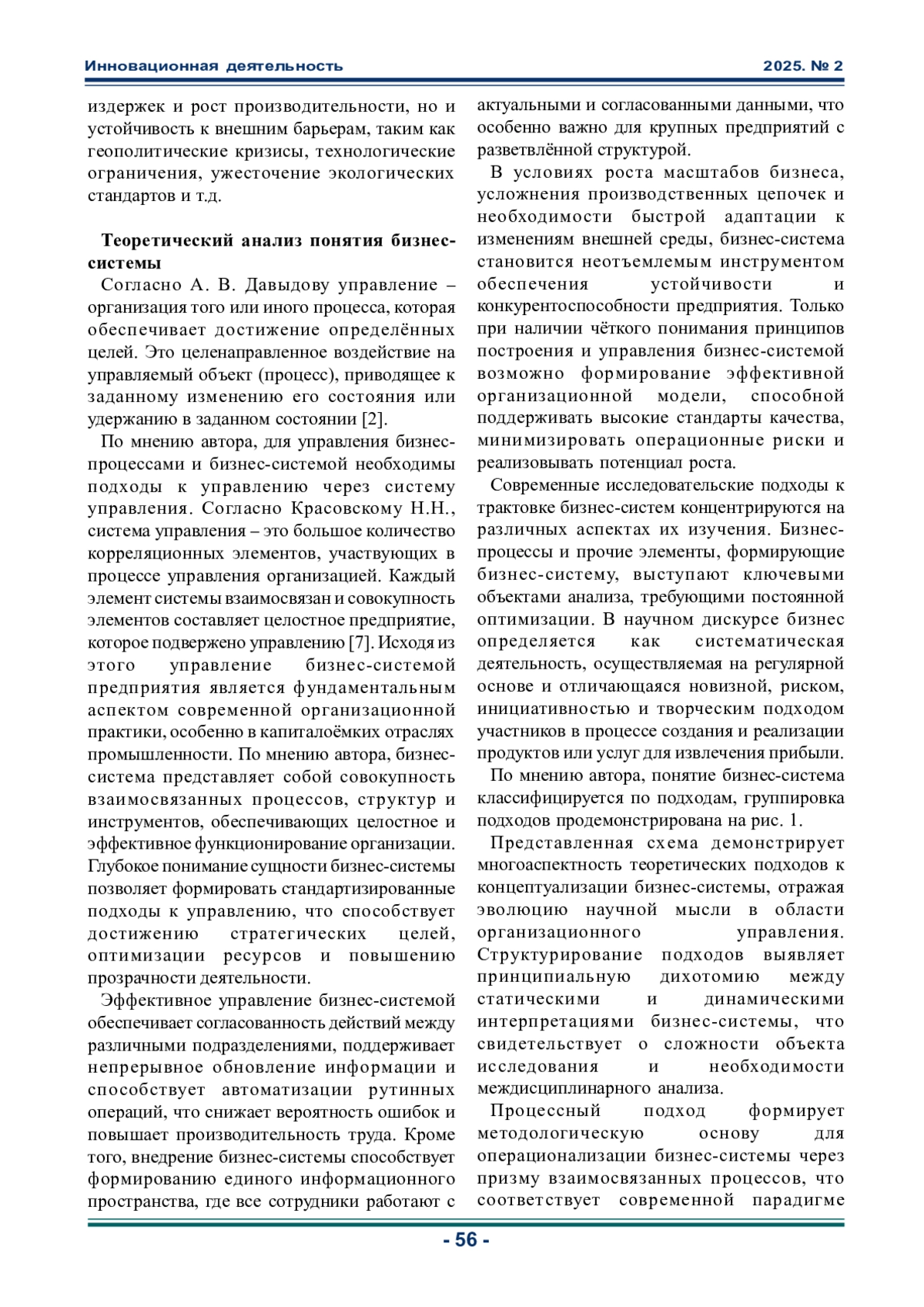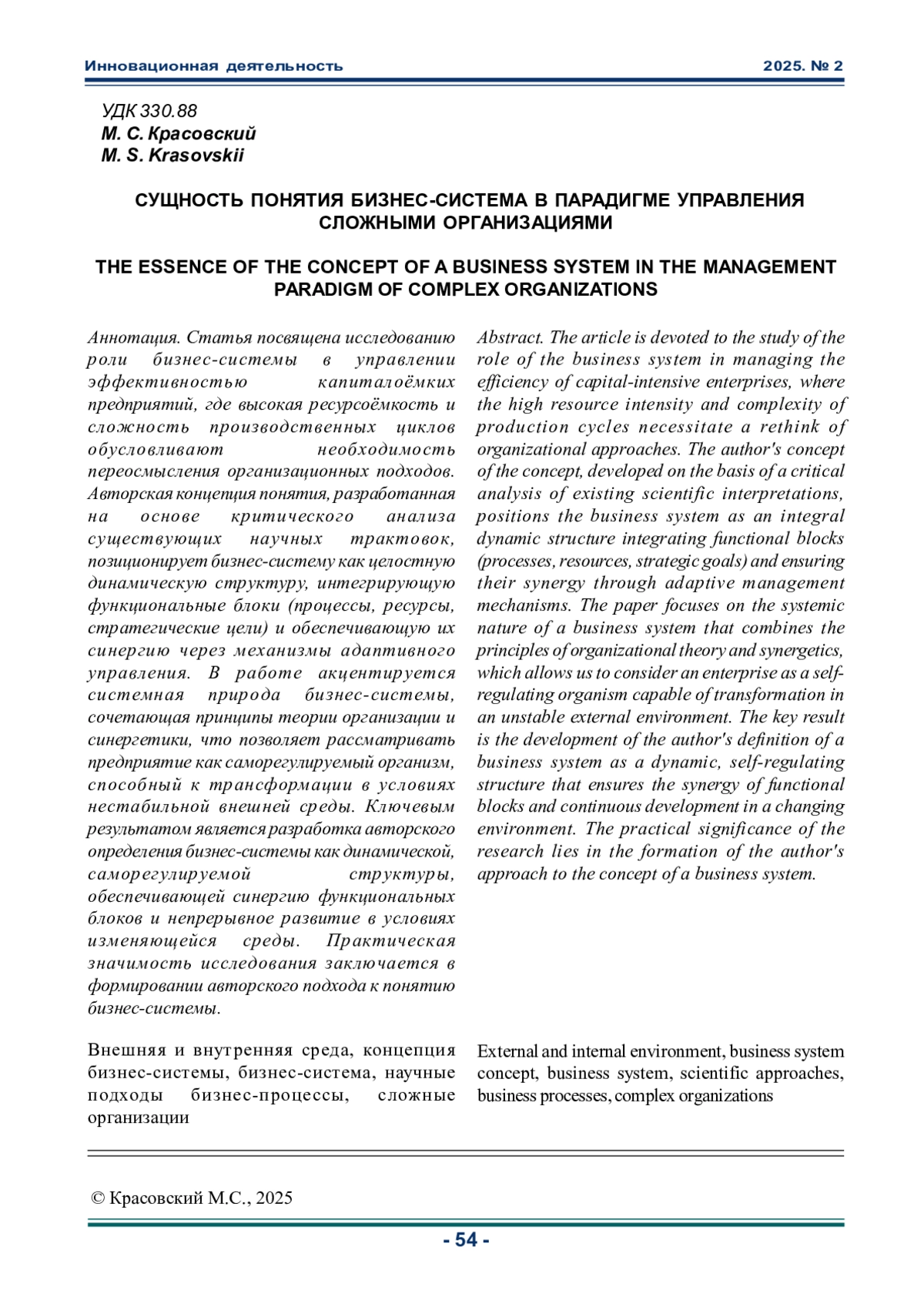 Статья посвящена исследованию роли бизнес-системы в управлении эффективностью капиталоёмких предприятий, где высокая ресурсоёмкость и сложность производственных циклов обусловливают необходимость переосмысления организационных подходов. Авторская концепция понятия, разработанная на основе критического анализа существующих научных трактовок, позиционирует бизнес-систему как целостную динамическую структуру, интегрирующую функциональные блоки (процессы, ресурсы, стратегические цели) и обеспечивающую их синергию через механизмы адаптивного управления. В работе акцентируется системная природа бизнес-системы, сочетающая принципы теории организации и синергетики, что позволяет рассматривать предприятие как саморегулируемый организм, способный к трансформации в условиях нестабильной внешней среды. Ключевым результатом является разработка авторского определения бизнес-системы как динамической, саморегулируемой структуры, обеспечивающей синергию функциональных блоков и непрерывное развитие в условиях изменяющейся среды. Практическая значимость исследования заключается в формировании авторского подхода к понятию бизнес-системы.