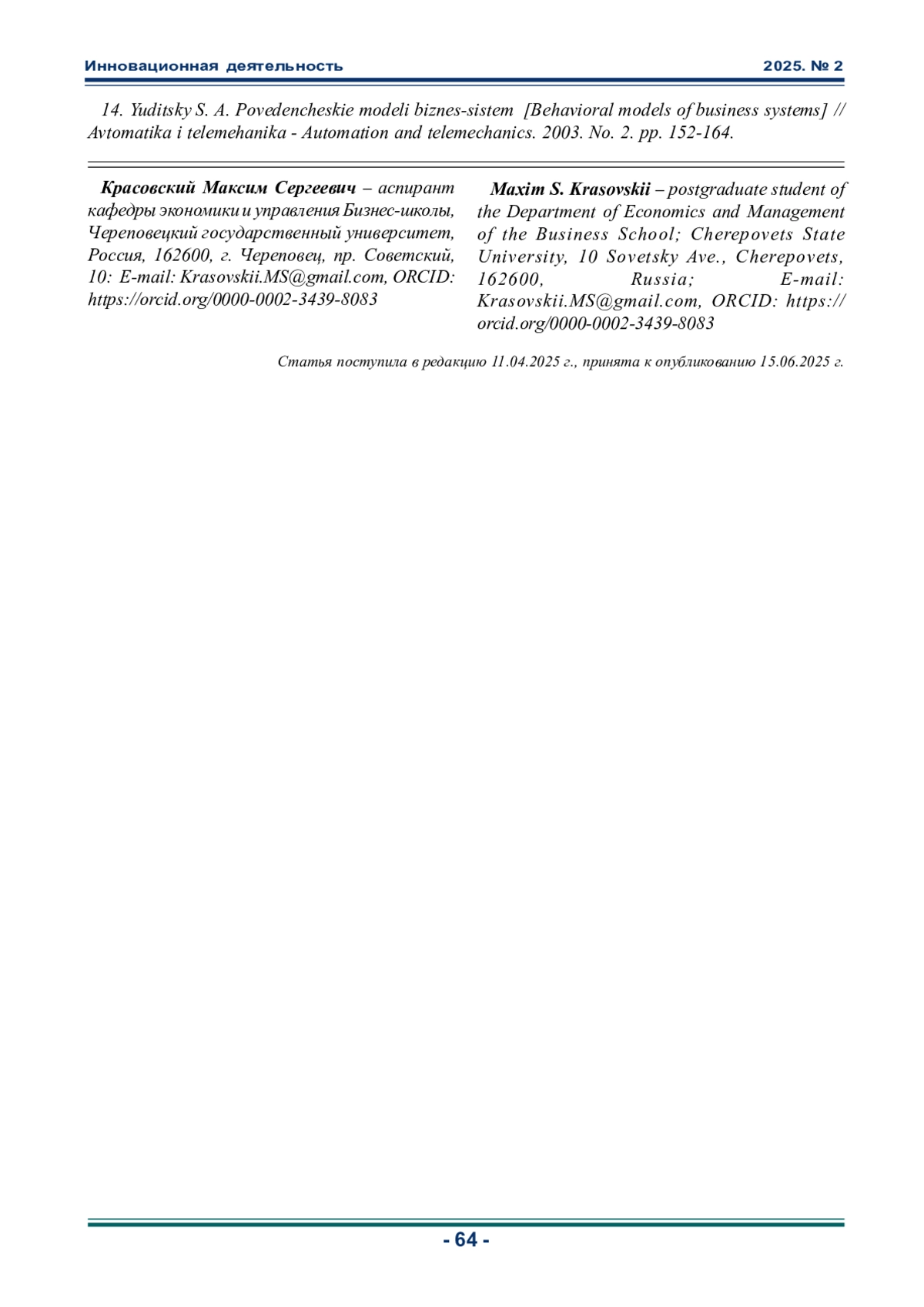 14. 	Юдицкий С. А. Поведенческие модели бизнес-систем // Автоматика и телемеханика. 2003. № 2. С. 152-164. EDN: NTJKFD