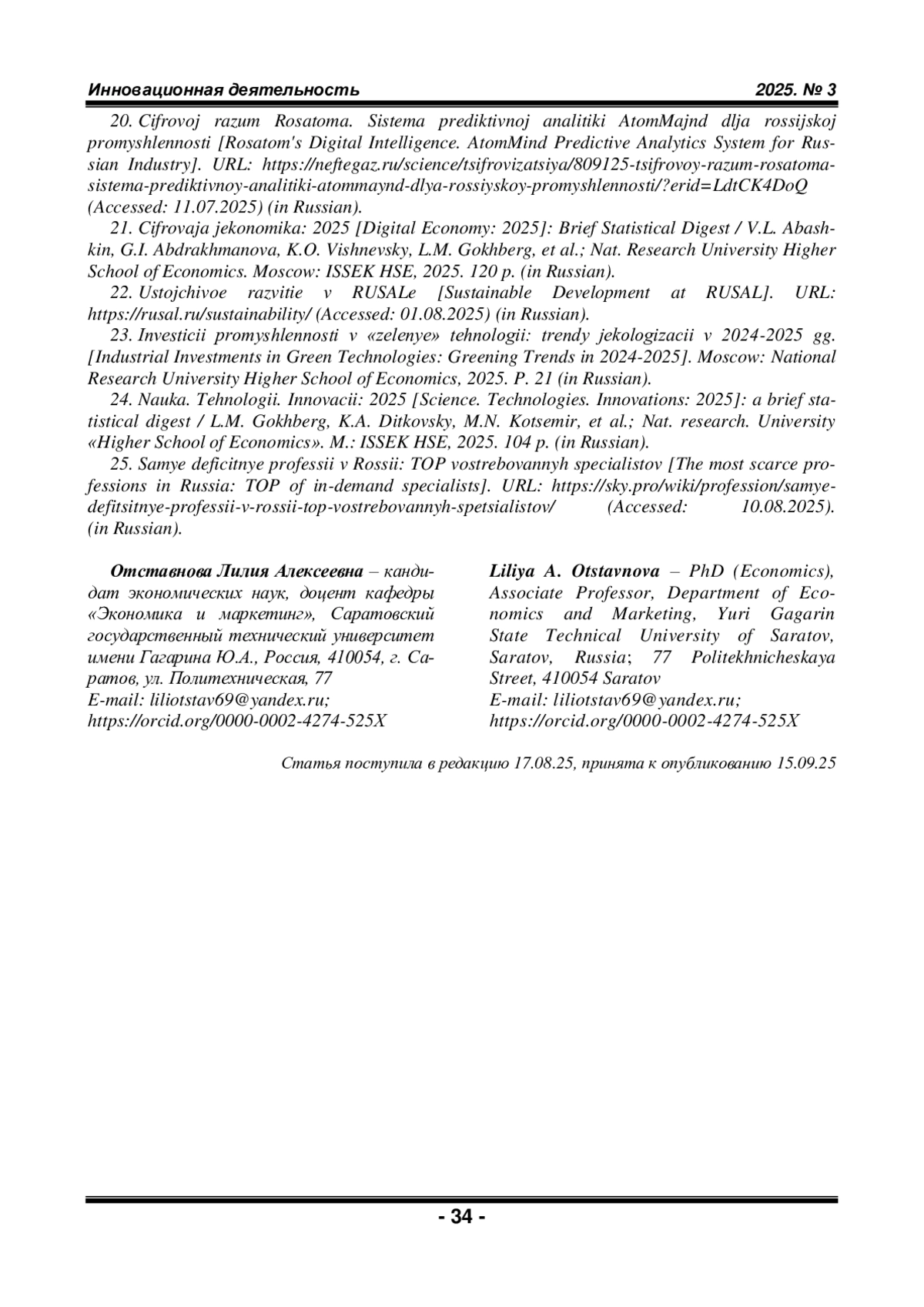12. 	Янченко Е.В. Цифровые инновации в решении вопросов устойчивого природопользования и энергосбережения // Инновационная деятельность. 2025. № 2 (73). С. 25-35.