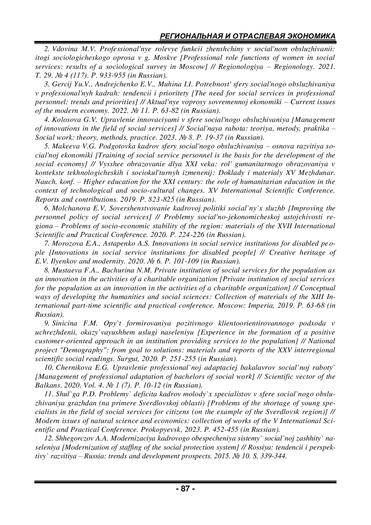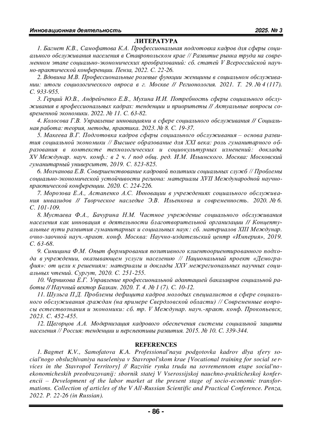 3. 	Герций Ю.В., Андрейченко Е.В., Мухина И.И. Потребность сферы социального обслуживания в профессиональных кадрах: тенденции и приоритеты // Актуальные вопросы современной экономики. 2022. № 11. С. 63-82.