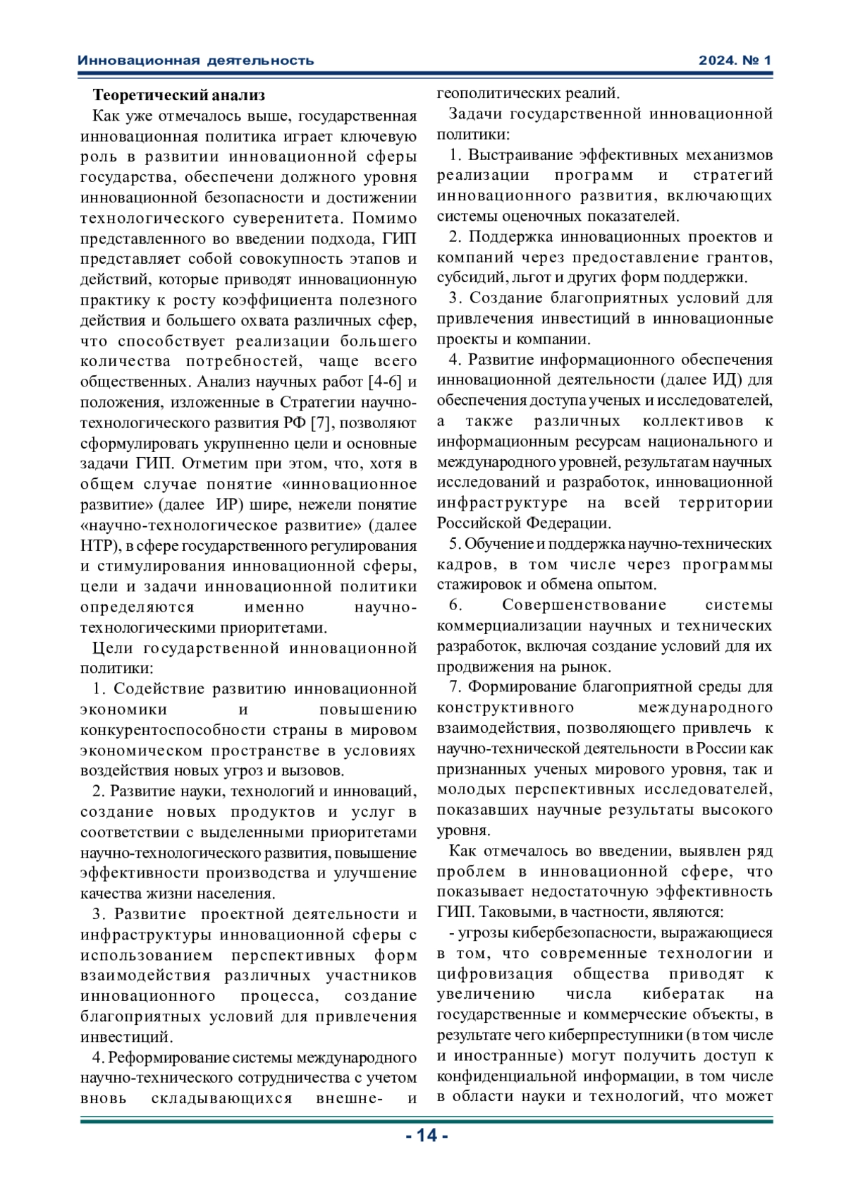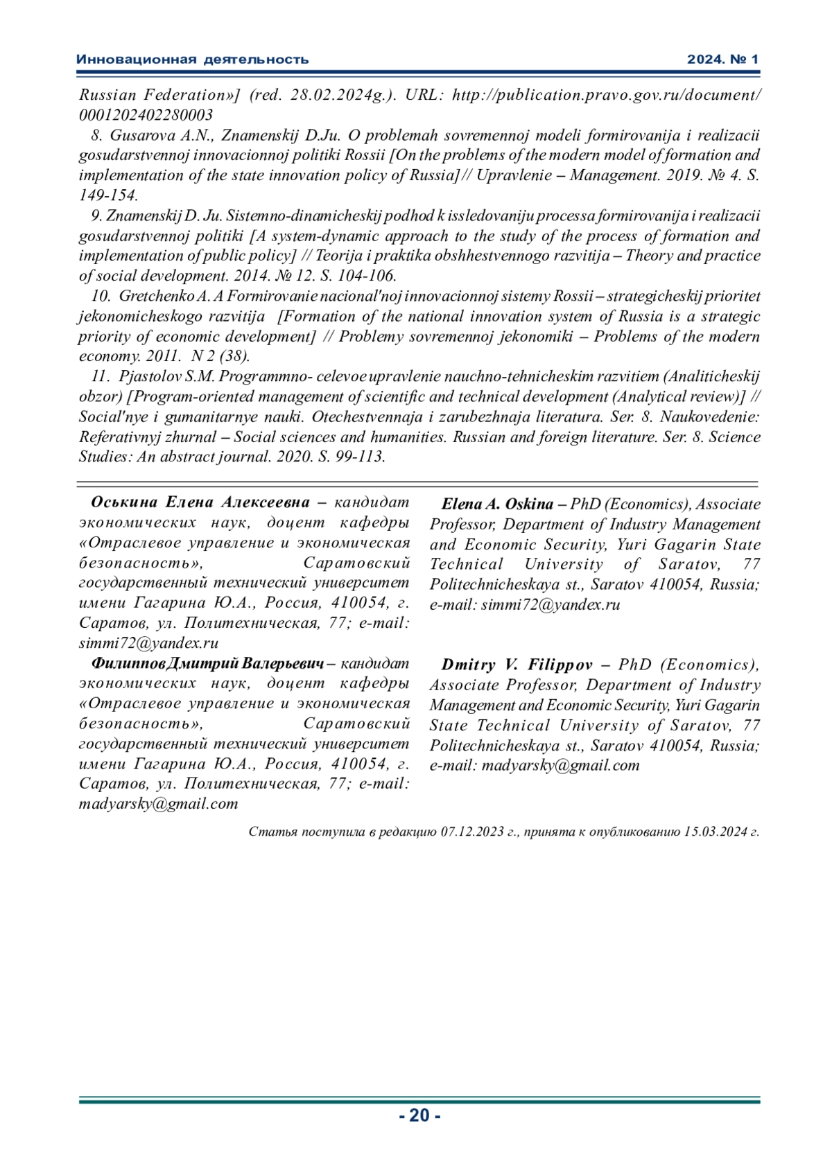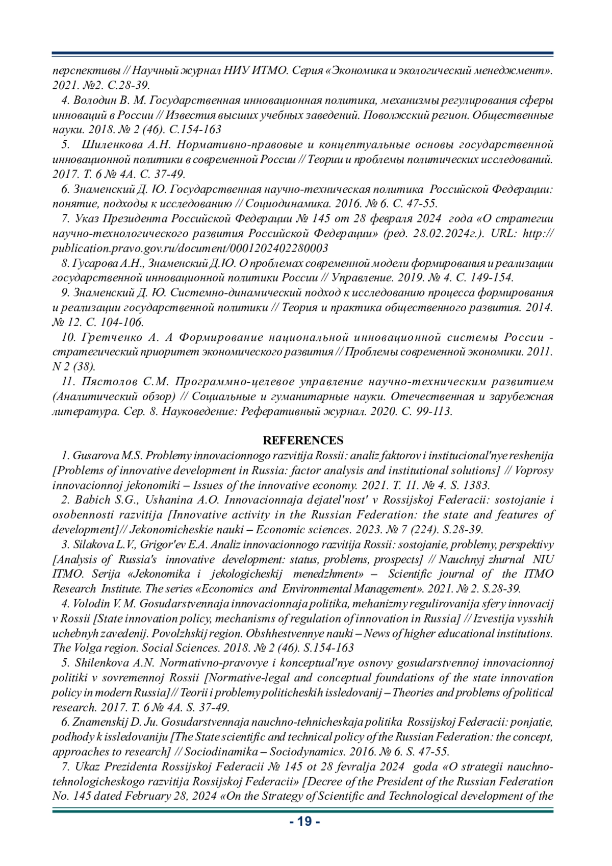 8. 	Гусарова А.Н., Знаменский Д.Ю. О проблемах современной модели формирования и реализации государственной инновационной политики России // Управление. 2019. № 4. С. 149-154. EDN: HGFCPX