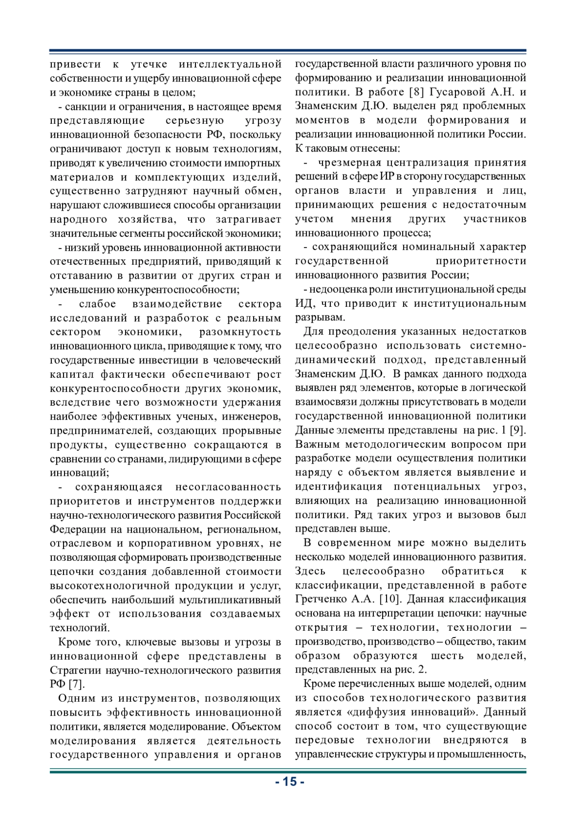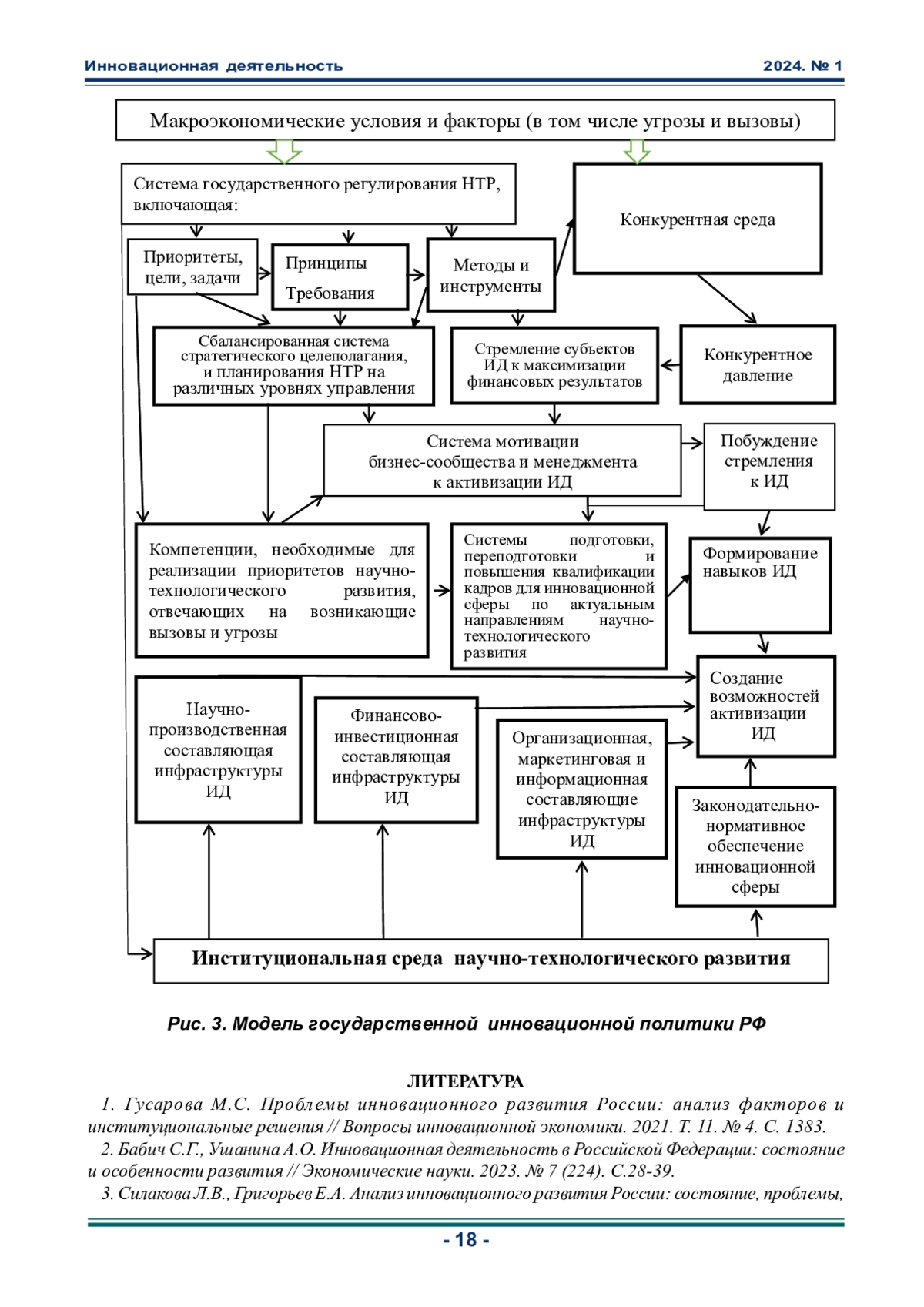 1. 	Гусарова М.С. Проблемы инновационного развития России: анализ факторов и институциональные решения // Вопросы инновационной экономики. 2021. Т. 11. № 4. С. 1383. EDN: AFUPPT