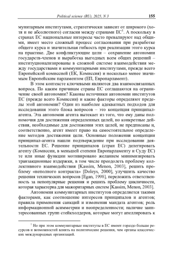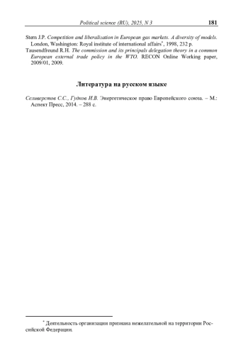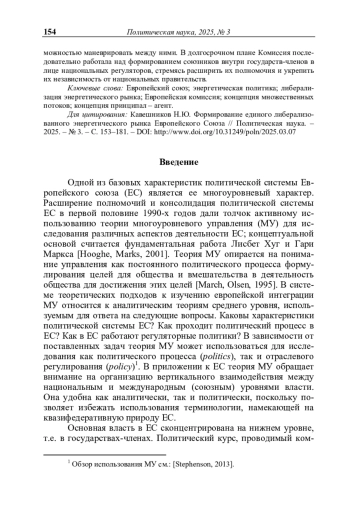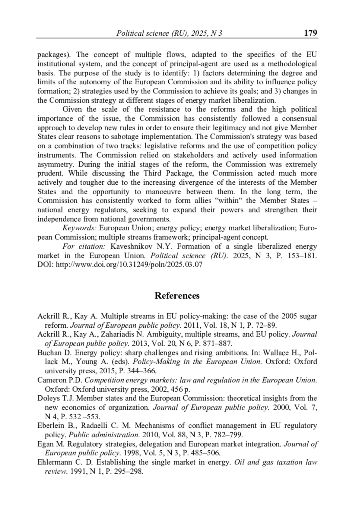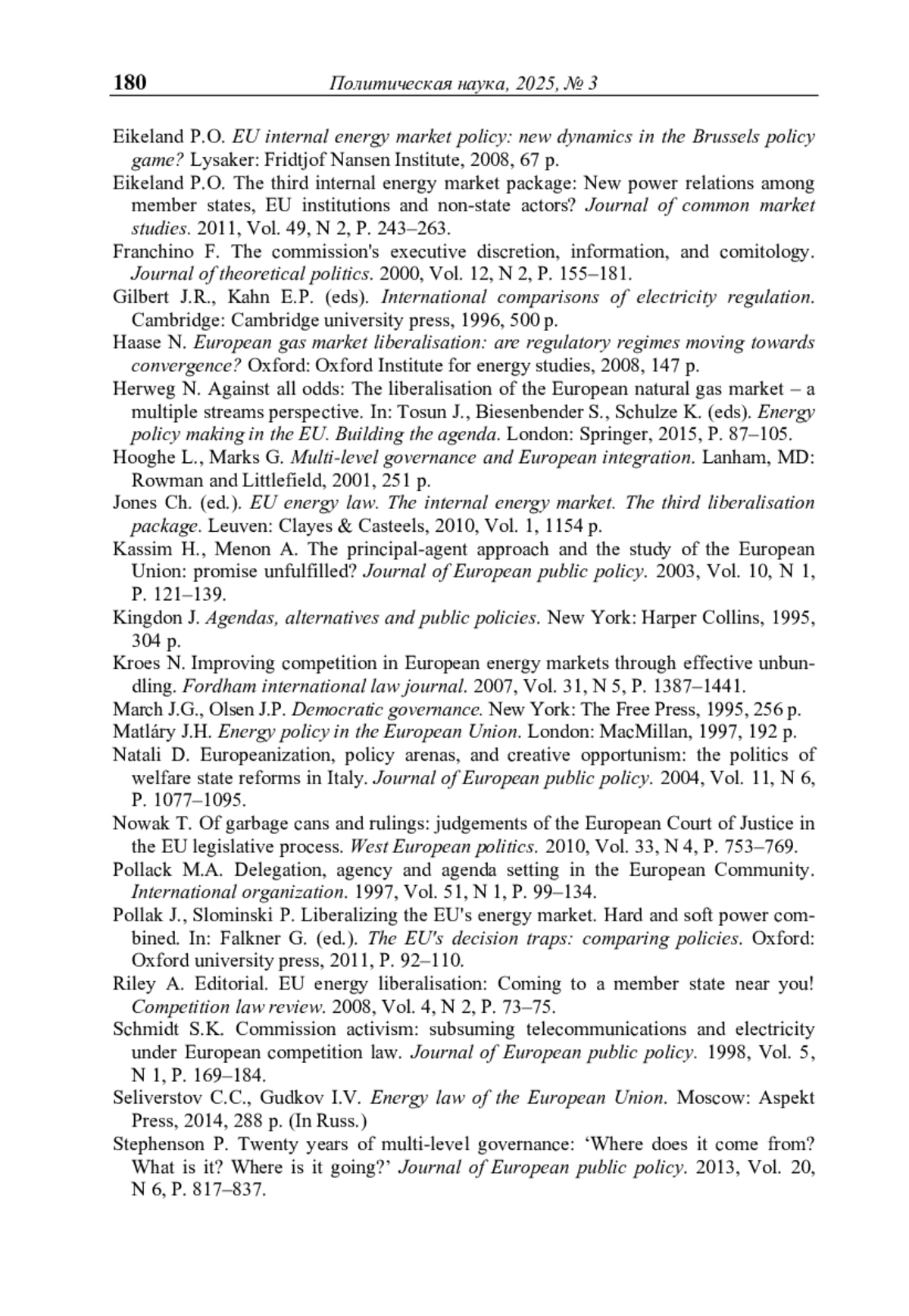 В статье анализируется функционирование многоуровневой системы управления в Европейском союзе на примере формирования единого либерализованного энергетического рынка ЕС. Исследование охватывает три этапа реформ (Первый, Второй и Третий энергетические пакеты). В качестве методологической основы использована концепция множественных потоков, адаптированная к специфике институциональной системы ЕС, и концепция принципал-агента. Задача исследования состоит в том, чтобы выявить: 1) факторы, определяющие степень и пределы автономии Европейской комиссии (ЕК) и ее возможности влиять на формирование политического курса; 2) стратегии, использованные ЕК для достижения своих целей; и 3) изменение стратегии ЕК на разных этапах либерализации энергетического рынка.