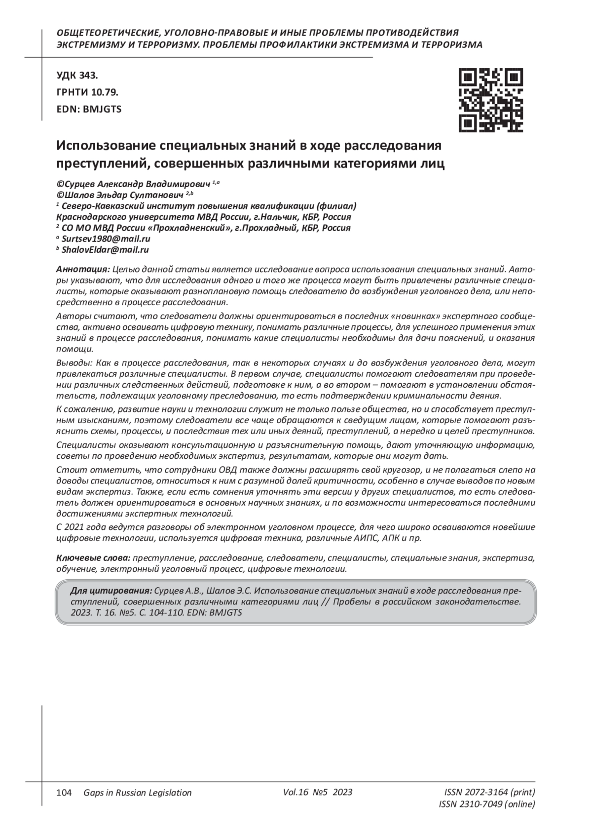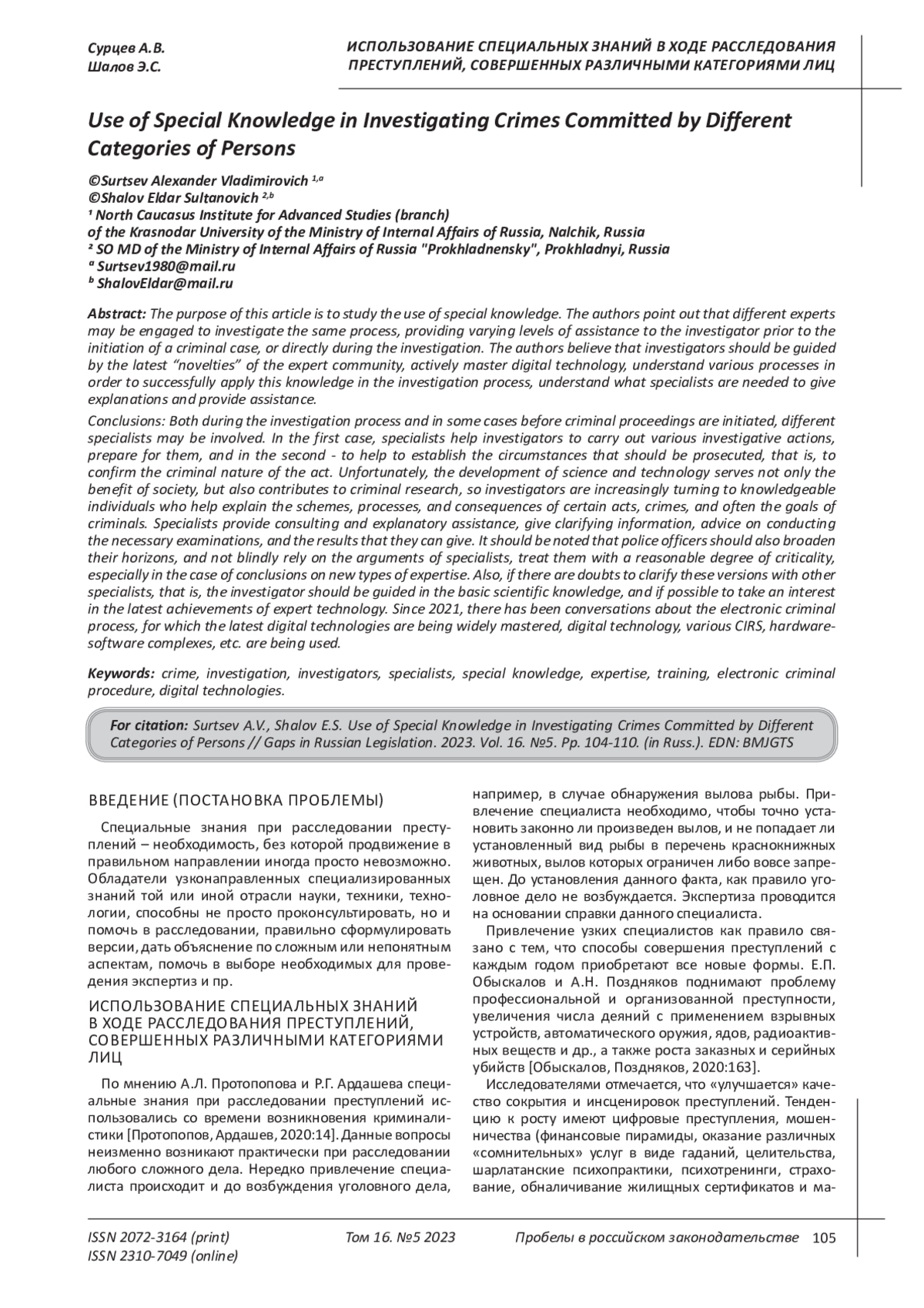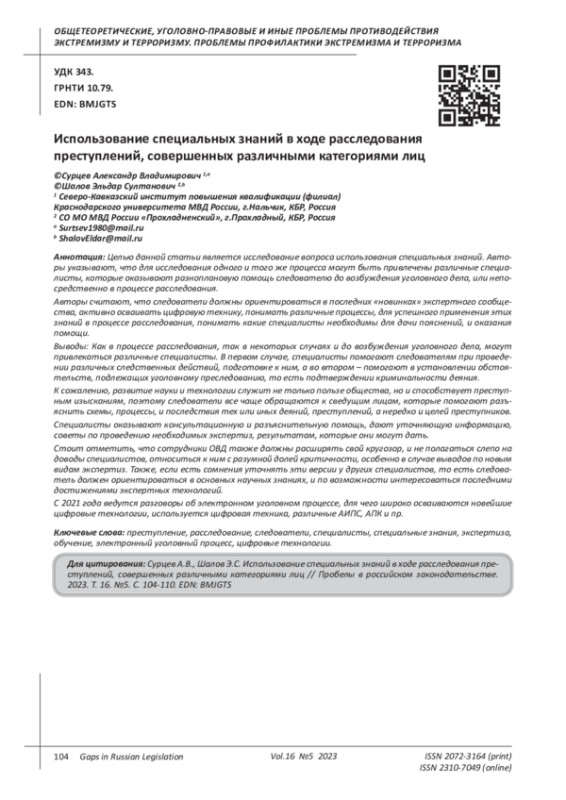 Целью данной статьи является исследование вопроса использования специальных знаний. Авторы указывают, что для исследования одного и того же процесса могут быть привлечены различные специалисты, которые оказывают разноплановую помощь следователю до возбуждения уголовного дела, или непосредственно в процессе расследования. Авторы считают, что следователи должны ориентироваться в последних «новинках» экспертного сообщества, активно осваивать цифровую технику, понимать различные процессы, для успешного применения этих знаний в процессе расследования, понимать какие специалисты необходимы для дачи пояснений, и оказания помощи. Выводы: Как в процессе расследования, так в некоторых случаях и до возбуждения уголовного дела, могут привлекаться различные специалисты. В первом случае, специалисты помогают следователям при проведении различных следственных действий, подготовке к ним, а во втором - помогают в установлении обстоятельств, подлежащих уголовному преследованию, то есть подтверждении криминальности деяния. К сожалению, развитие науки и технологии служит не только пользе общества, но и способствует преступным изысканиям, поэтому следователи все чаще обращаются к сведущим лицам, которые помогают разъяснить схемы, процессы, и последствия тех или иных деяний, преступлений, а нередко и целей преступников. Специалисты оказывают консультационную и разъяснительную помощь, дают уточняющую информацию, советы по проведению необходимых экспертиз, результатам, которые они могут дать. Стоит отметить, что сотрудники ОВД также должны расширять свой кругозор, и не полагаться слепо на доводы специалистов, относиться к ним с разумной долей критичности, особенно в случае выводов по новым видам экспертиз. Также, если есть сомнения уточнять эти версии у других специалистов, то есть следователь должен ориентироваться в основных научных знаниях, и по возможности интересоваться последними достижениями экспертных технологий. С 2021 года ведутся разговоры об электронном уголовном процессе, для чего широко осваиваются новейшие цифровые технологии, используется цифровая техника, различные АИПС, АПК и пр.