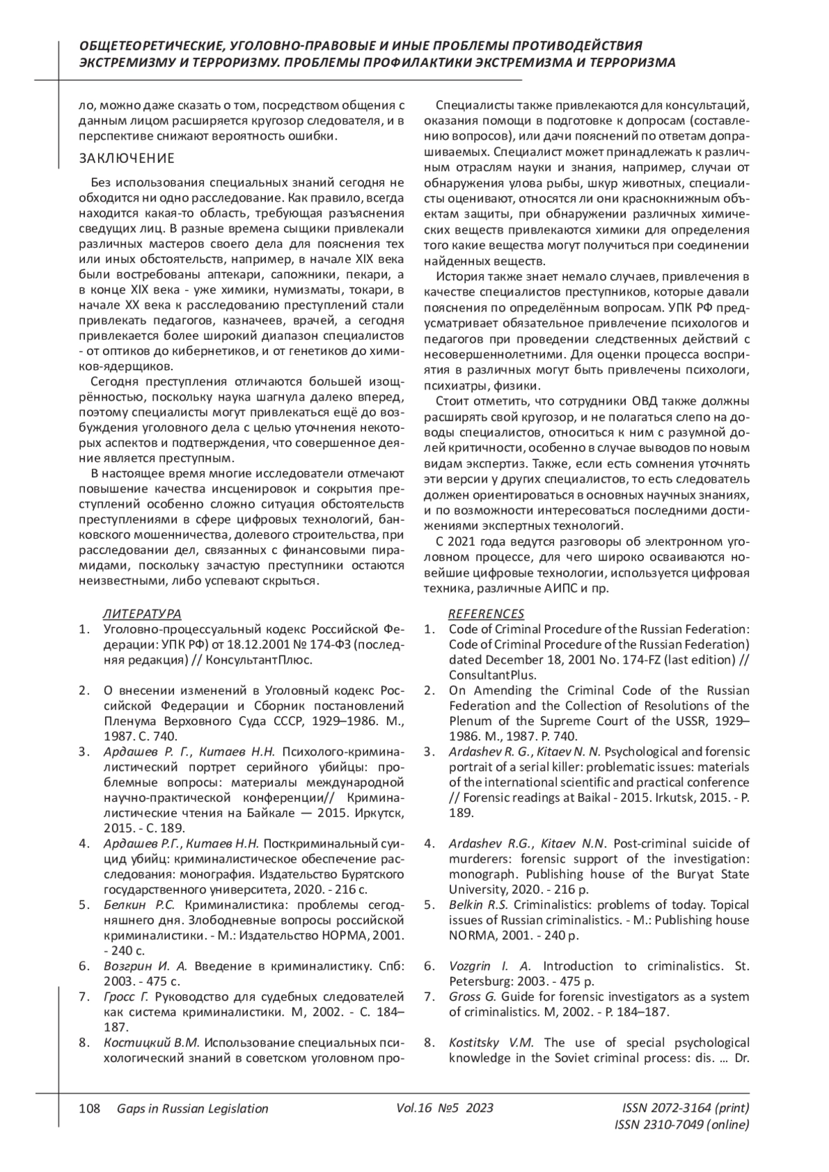4. Ардашев Р.Г., Китаев Н.Н. Посткриминальный суицид убийц: криминалистическое обеспечение расследования: монография. Издательство Бурятского государственного университета, 2020. - 216 с. EDN: EFOQWZ