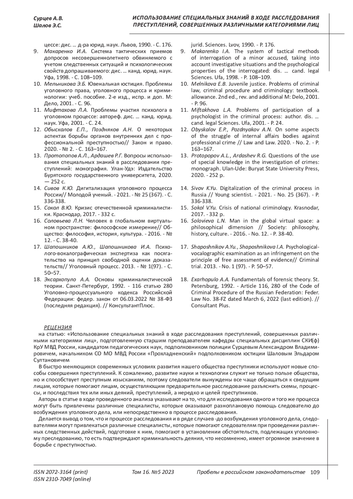 13. Протопопов А.Л., Ардашев Р.Г. Вопросы использования специальных знаний в расследовании преступлений: монография. Улан-Удэ: Издательство Бурятского государственного университета, 2020. - 252 с. EDN: CQIXUM