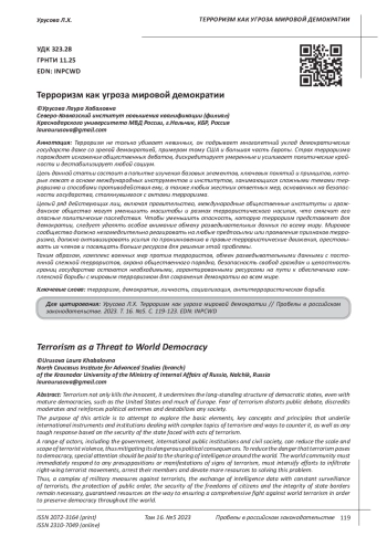 Терроризм не только убивает невинных, он подрывает многолетний уклад демократических государств даже со зрелой демократией, примером тому США и большая часть Европы. Страх терроризма порождает искажение общественных дебатов, дискредитирует умеренные и усиливает политические крайности и дестабилизирует любой социум. Цель данной статьи состоит в попытке изучения базовых элементов, ключевых понятий и принципов, которые лежат в основе международных инструментов и институтов, занимающихся сложными темами терроризма и способами противодействия ему, а также любых жестких ответных мер, основанных на безопасности государства, столкнувшегося с актами терроризма. Целый ряд действующих лиц, включая правительство, международные общественные институты и гражданское общество могут уменьшить масштабы и размах террористического насилия, что смягчит его опасные политические последствия. Чтобы уменьшить опасность, которую терроризм представляет для демократии, следует уделять особое внимание обмену разведывательных данных по всему миру. Мировое сообщество должно незамедлительно реагировать на любые предпосылки или проявления признаков терроризма, должно активизировать усилия по проникновению в правые террористические движения, арестовывать их членов и посвящать больше ресурсов для решения этой проблемы. Таким образом, комплекс военных мер против террористов, обмен разведывательными данными с постоянной слежкой террористов, охрана общественного порядка, безопасность свобод граждан и целостность границ государства остаются необходимыми, гарантированными ресурсами на пути к обеспечению комплексной борьбы с мировым терроризмом для сохранения демократии во всем мире.