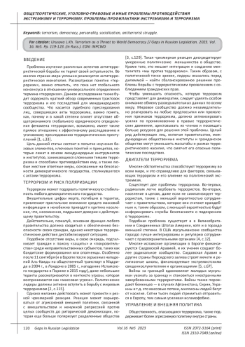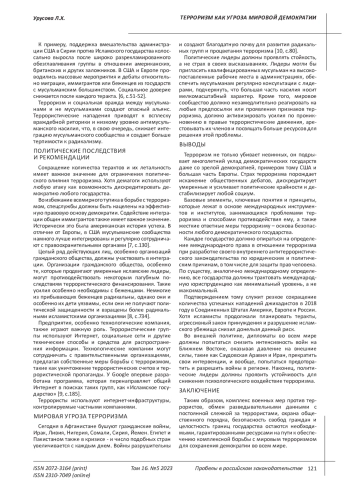 Dorrine F. Causes and consequences of terrorist acts // Law and Law. - Cambridge. Volume 12. № 3. P. 124-131.